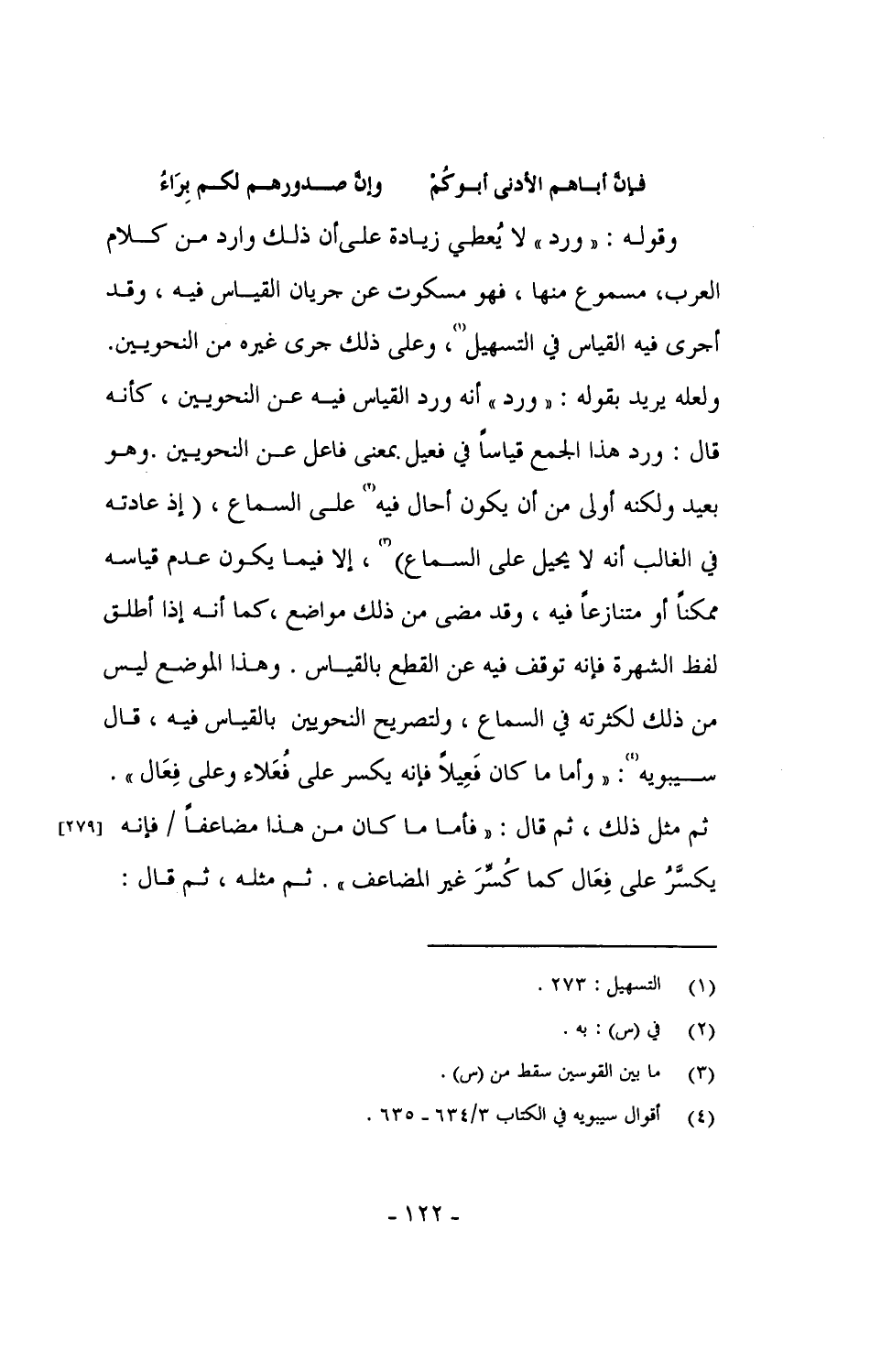 وقوله: "ورد" لا يُعطى زيادة على أن ذلك وارد من كلام العرب، مسموع منها، فهو مسكوت عن جريان القياس فيه، وقد أجرى فيه القياس في التسهيل، وعلى ذلك جرى غيره من النحويين. ولعله يريد بقوله: "ورد" أنه ورد القياس فيه عن النحويين، كأنه قال: ورد هذا الجمع قياساً في فعيل بمعنى فاعل عن النحويين. وهو بعيد ولكنه أولى من أن يكون أحال فيه على السماع، (إذ عادته في الغالب أنه لا يحيل على السماع)، إلا فيما يكون عدم قياسه ممكناً أو متنازعاً فيه، وقد مضى من ذلك مواضع، كما أنه إذا أطلق لفظ الشهرة فإنه توقف فيه عن القطع بالقياس. وهذا الموضع ليس من ذلك لكثرته في السماع، ولتصريح النحويين بالقياس فيه، قال سيبويه: "وأما ما كان فَعِيلاً فإنه يكسر على فُعَلاء وعلى فِعَال". ثم مثل ذلك، ثم قال: "فأما ما كان من هذا مضاعفاً / فإنه يكسَّرُ على فِعَال كما كُسِّرَ غير المضاعف". ثم مثله، ثم قال: