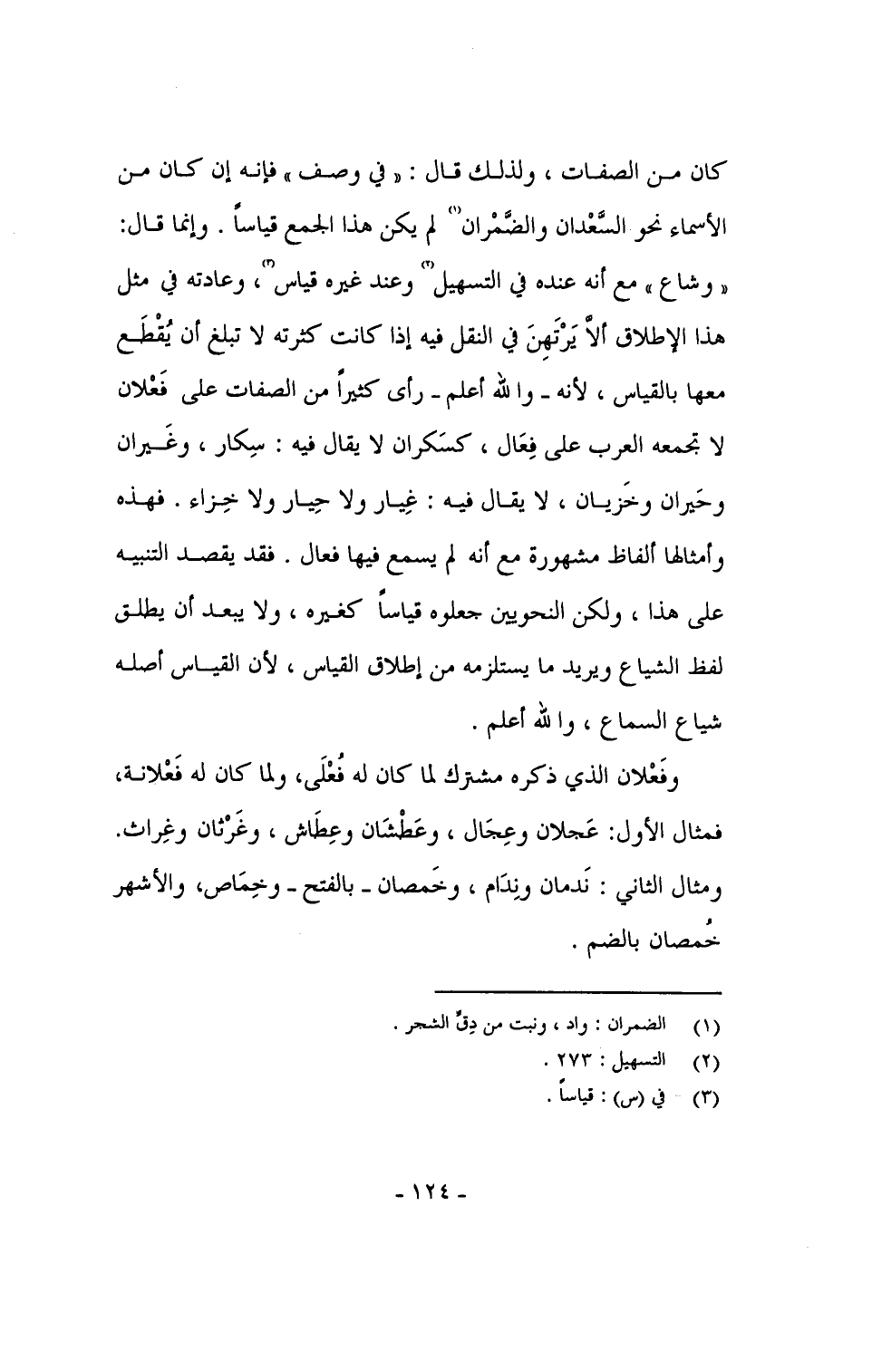 وفَعْلان الذي ذكره مشترك لما كان له فُعْلَى، ولما كان له فَعْلانة، فمثال الأول: عَجلان وعِجَال، وعطشان وعِطَاش، وغَرثان وغِراث. ومثال الثاني: نَدمان ونِدَام، وخَمصان - بالفتح - وخِمَاص، والأشهر خُمصان بالضم.