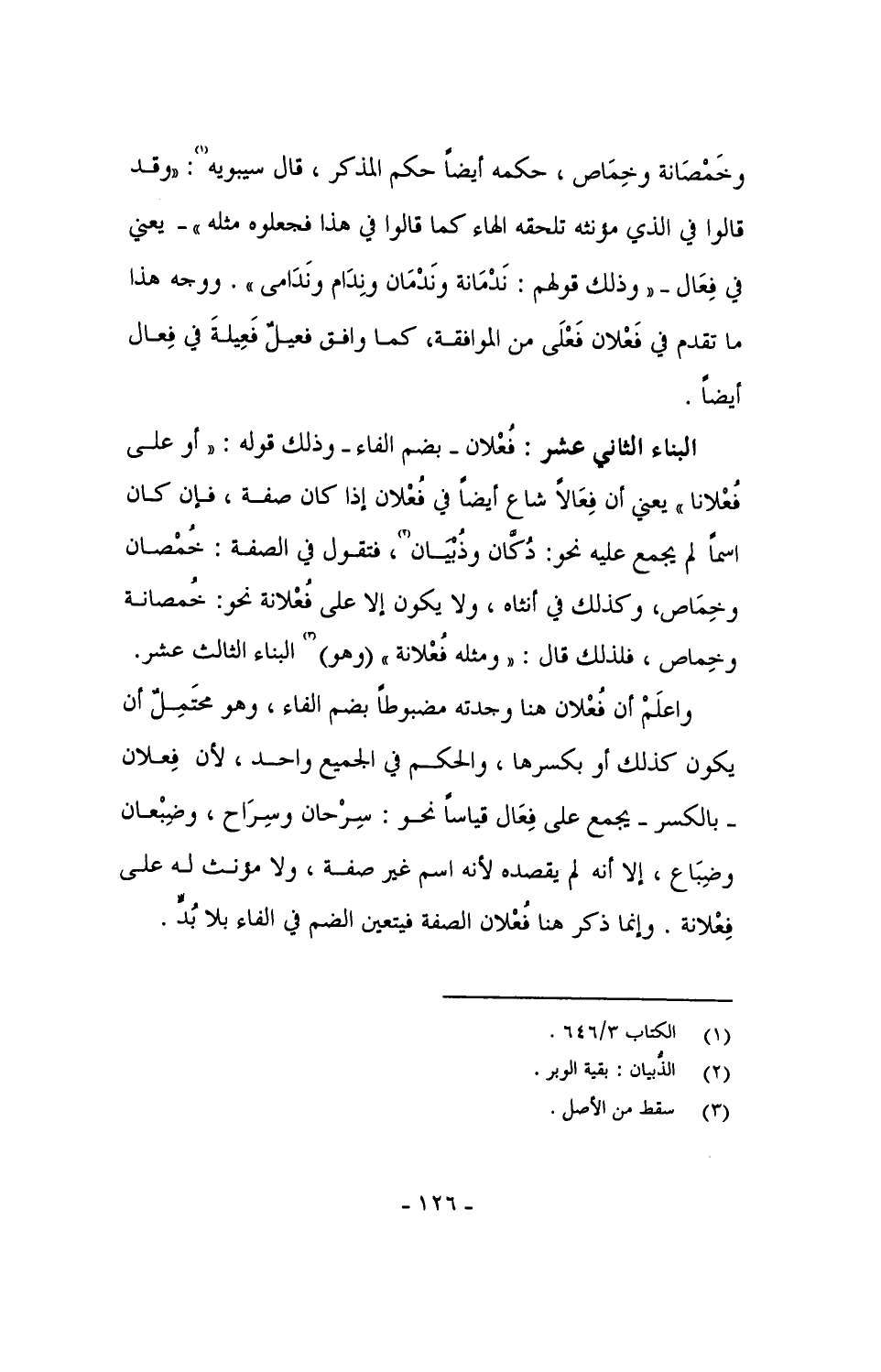 واعلمْ أن فُعْلان هنا وجدته مضبوطاً بضم الفاء، وهو محتَمِلٌ أن يكون كذلك أو بكسرها، والحكم في الجميع واحد، لأن فِعلان - بالكسر - يجمع على فِعَال قياساً نحو: سِرْحان وسِرَاح، وضِبْعان وضِبَاع، إلا أنه لم يقصده لأنه اسم غير صفة، ولا مؤنث له على فِعْلانة. وإنما ذكر هنا فُعْلان الصفة فيتعين الضم في الفاء بلا بُدٍّ.