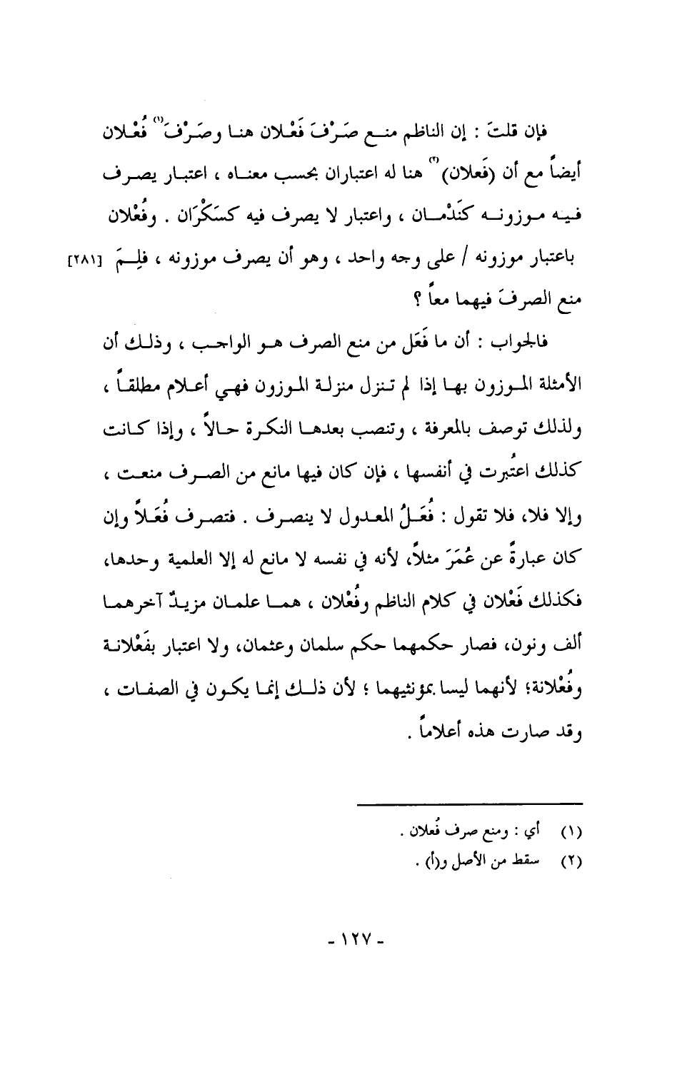 فالجواب: أن ما فَعَل من منع الصرف هو الواجب، وذلك أن الأمثلة الموزون بها إذا لم تنزل منزلة الموزون فهي أعلام مطلقاً، ولذلك توصف بالمعرفة، وتنصب بعدها النكرة حالاً، وإذا كانت كذلك اعتُبرت في أنفسها، فإن كان فيها مانع من الصرف منعت، وإلا فلا، فلا تقول: فُعَلُ المعدول لا ينصرف. فتصرف فُعَلاً وإن كان عبارةً عن عُمَرَ مثلاً، لأنه في نفسه لا مانع له إلا العلمية وحدها، فكذلك فَعْلان في كلام الناظم وفُعْلان، هما علمان مزيدٌ آخرهما ألف ونون، فصار حكمهما حكم سلمان وعثمان، ولا اعتبار بفَعْلانة وفُعْلانة؛ لأنهما ليسا بمؤنثيهما؛ لأن ذلك إنما يكون في الصفات، وقد صارت هذه أعلاماً.