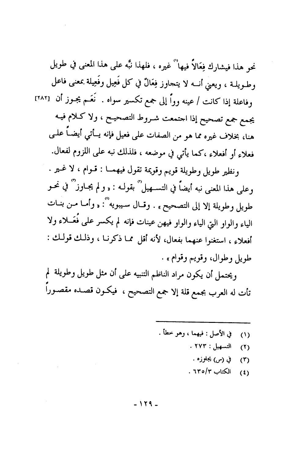 ونظير طويل وطويلة قويم وقويمة تقول فيهما: قوام، لا غير. وعلى هذا المعنى نبه أيضاً في التسهيل بقوله: "ولم يجاوز في نحو طويل وطويلة إلا إلى التصحيح". وقال سيبويه: "وأما من بنات الياء والواو التي الياء والواو فيهن عينات فإنه لم يكسر على فُعَلاء ولا أفعلاء، استغنوا عنهما بفعال، لأنه أقل مما ذكرنا، وذلك قولك: طويل وطوال، وقويم وقوام".