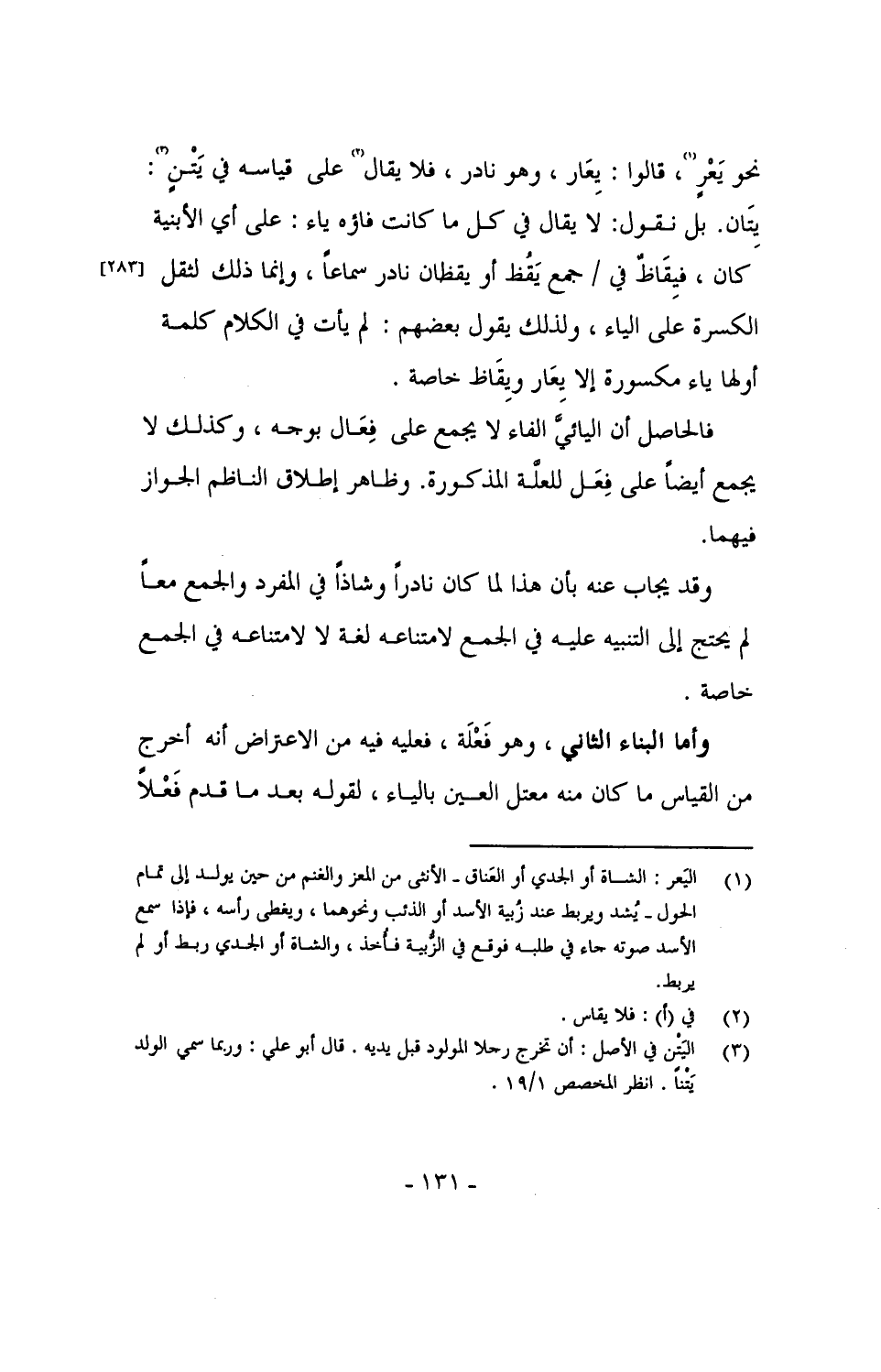 نحو يَعْرٍ، قالوا: يِعَار، وهو نادر، فلا يقال على قياسه في يَتْنٍ: يِتَان. بل نقول: لا يقال في كل ما كانت فاؤه ياء: على أي الأبنية كان، فيِقَاظٌ في / جمع يَقُظ أو يقظان نادر سماعاً، وإنما ذلك لثقل الكسرة على الياء، ولذلك يقول بعضهم: لم يأتِ في الكلام كلمة أولها ياء مكسورة إلا يِعَار ويِقَاظ خاصة.