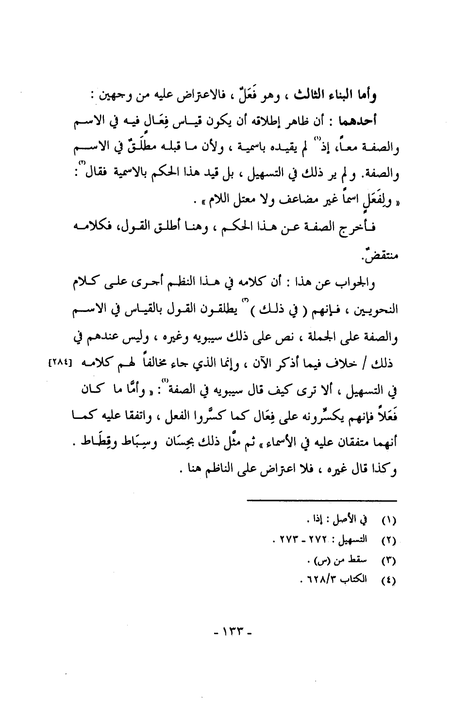 والجواب عن هذا: أن كلامه في هذا النظم أجرى على كلام النحويين، فإنهم (في ذلك) يطلقون القول بالقياس في الاسم والصفة على الجملة، نص على ذلك سيبويه وغيره، وليس عندهم في ذلك / خلاف فيما أذكر الآن، وإنما الذي جاء مخالفاً لهم كلامه في التسهيل، ألا ترى كيف قال سيبويه في الصفة: "وأما ما كان فَعَلاً فإنهم يكسِّرونه على فِعَال كما كسَّروا الفعل، واتفقا عليه كما أنهما متفقان عليه في الأسماء" ثم مثَّل ذلك بِحسان وسِباط وقِطاط. وكذا قال غيره، فلا اعتراض على الناظم هنا.