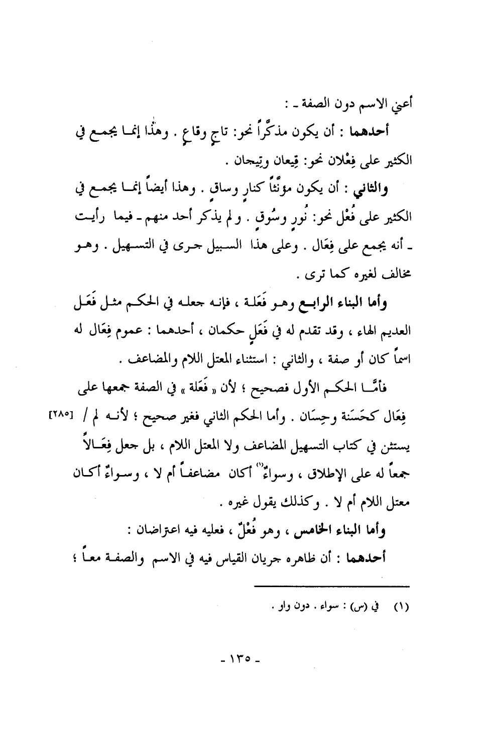 والثاني: أن يكون مؤنثاً كنارٍ وساقٍ. وهذا أيضاً إنما يجمع في الكثير على فُعْل نحو: نُورٍ وسُوقٍ. ولم يذكر أحد منهم - فيما رأيت - أنه يجمع على فِعَال. وعلى هذا السبيل جرى في التسهيل. وهو مخالف لغيره كما ترى.