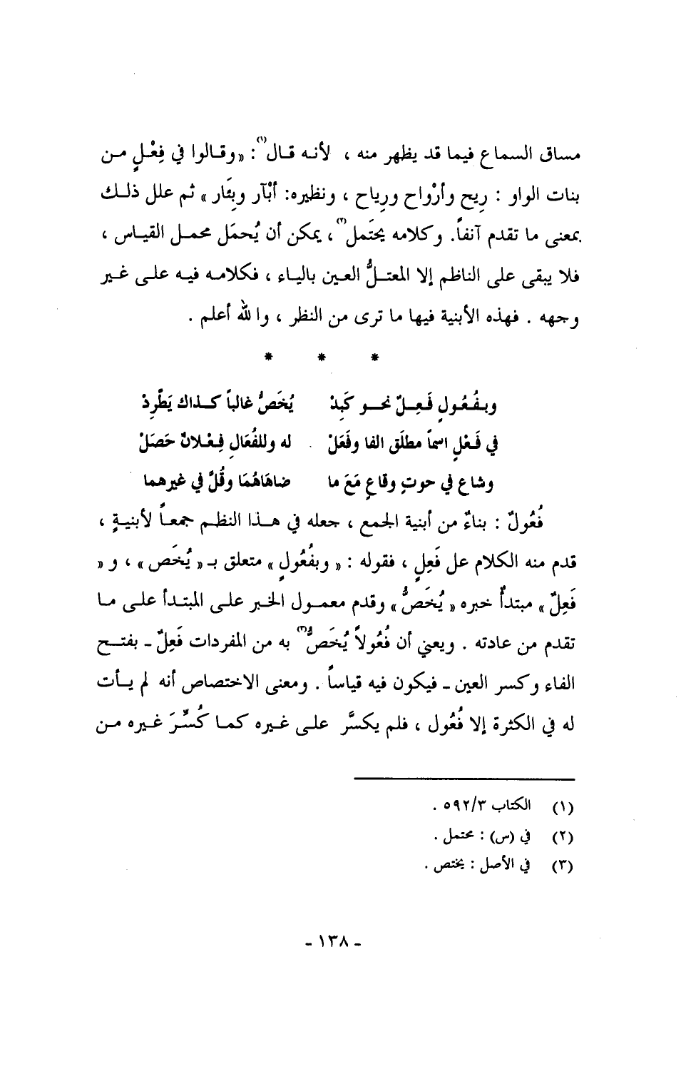مساق السماع فيما قد يظهر منه، لأنه قال: "وقالوا في فِعْلٍ من بنات الواو: رِيح وأرْواح ورِياح، ونظيره: أبْآر وبِئَار" ثم علل ذلك بمعنى ما تقدم آنفاً. وكلامه يحتمل، يمكن أن يُحمل محمل القياس، فلا يبقى على الناظم إلا المعتل العين بالياء، فكلامه فيه على غير وجهه. فهذه الأبنية فيها ما ترى من النظر، والله أعلم.