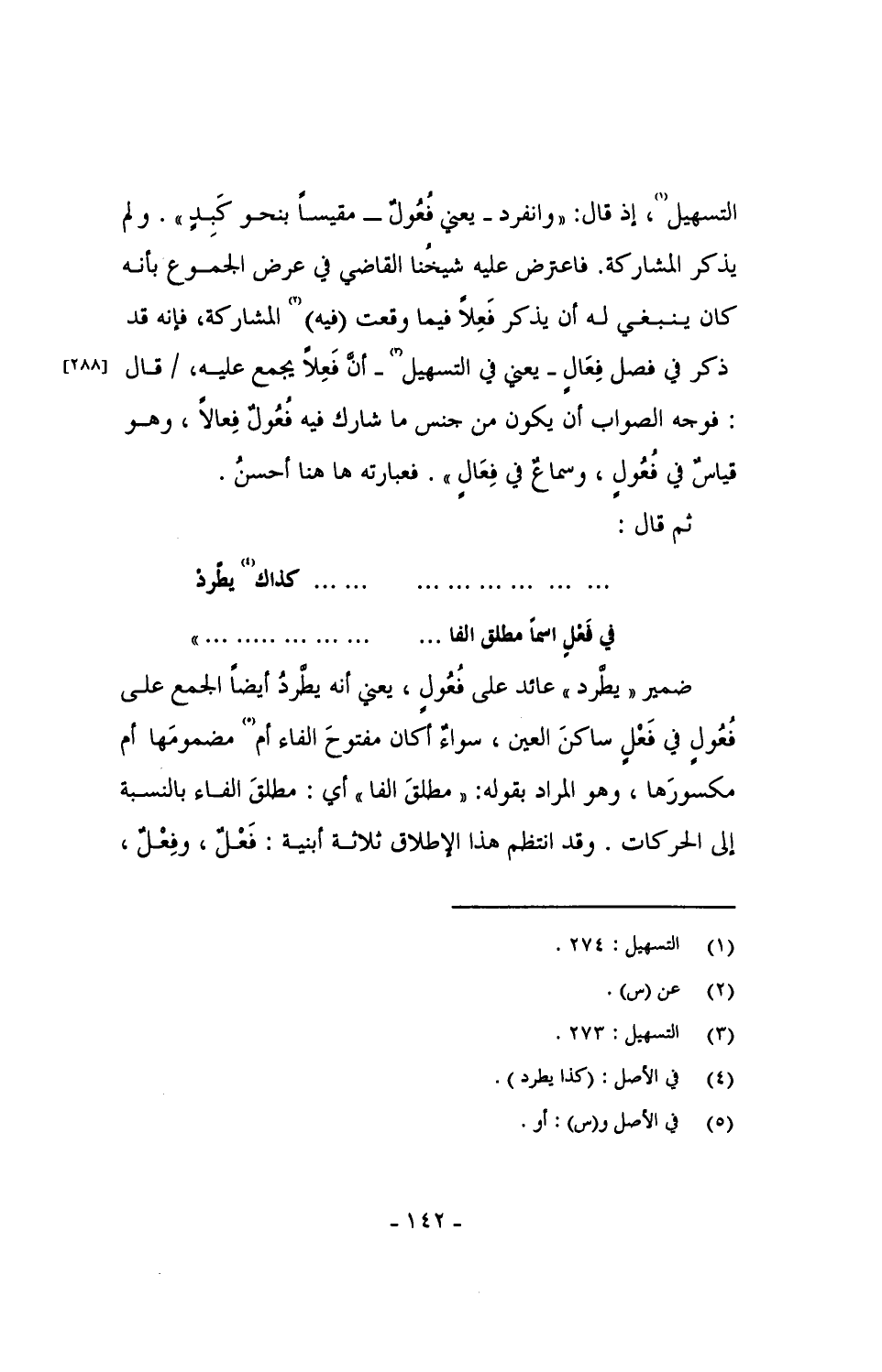 التسهيل، إذ قال: "وانفرد - يعني فُعُولٌ - مقيساً بنحو كَبِدٍ". ولم يذكر المشاركة. فاعترض عليه شيخنا القاضي في عرض الجموع بأنه كان ينبغي له أن يذكر فَعِلاً فيما وقعت (فيه) المشاركة، فإنه قد ذكر في فصل فِعَال - يعني في التسهيل - أن فَعِلاً يجمع عليه، / قال: فوجه الصواب أن يكون من جنس ما شارك فيه فُعُولٌ فِعَالاً، وهو قياسٌ في فُعُولٍ، وسماعٌ في فِعَالٍ". فعبارته ها هنا أحسنُ.