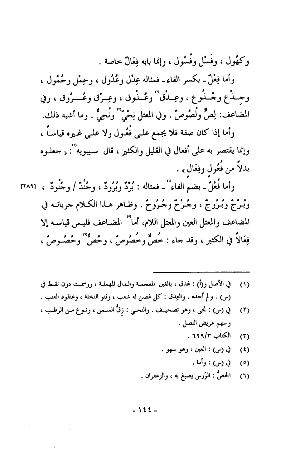 وأما فُعْلٌ - بضم الفاء - فمثاله: بُرْدٌ وبُرُودٌ، وجُنْدٌ / وجُنُودٌ، وبرج وبروج، وجرح وجروح. وظاهر هذا الكلام جريانه في المضاعف والمعتل العين والمعتل اللام، أما المضاعف فليس قياسه إلا فِعَالاً في الكثير، وقد جاء: خُصَّ وخُصُوص، وحُصٌّ وحُصُوصٌ،