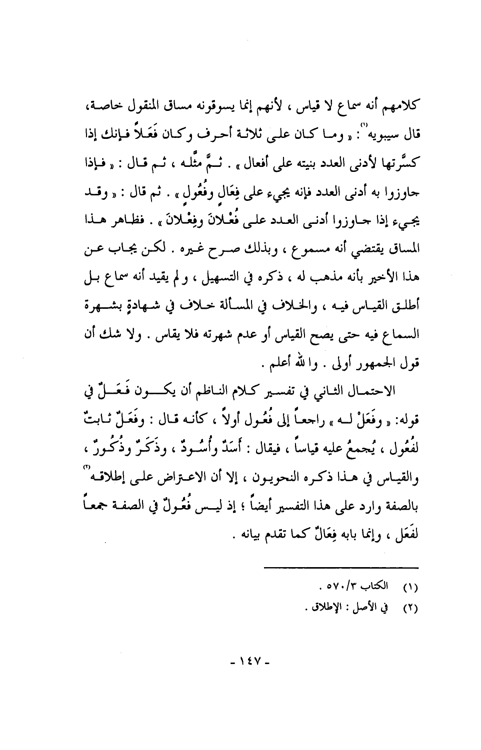 كلامهم أنه سماع لا قياس، لأنهم إنما يسوقونه مساق المنقول خاصة، قال سيبويه: "وما كان على ثلاثة أحرف وكان فَعَلاً فإنك إذا كسَّرتها لأدنى العدد فإنه يجيء على فِعَالٍ وفُعُولٍ". ثم قال: "وقد يجيء إذا جاوزوا أدنى العدد على فُعْلانَ وفِعْلانَ". فظاهر هذا المساق يقتضي أنه مسموع، وبذلك صرح غيره. لكن يجاب عن هذا الأخير بأنه مذهب له، ذكره في التسهيل، ولم يقيد أنه سماع بل أطلق القياس فيه، والخلاف ففي المسألة خلاف في شهادةٍ بشهرة السماع فيه حتى يصح القياس أو عدم شهرته فلا يقاس. ولا شك أن قول الجمهور أولى. والله أعلم.