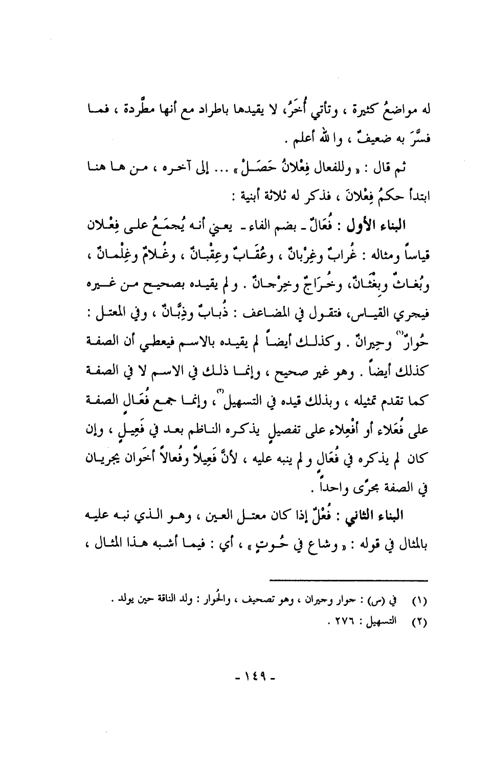 البناء الأول: فُعَالٌ - بضم الفاء - يعني أنه يُجمع على فِعْلان قياساً ومثاله: غُرابٌ وغِرْبانٌ، وعقاب وعقبان، وغلام وغِلمان، وبُغاث وبِغثان، وخُراج وخِرجان. ولم يقيده بصحيح من غيره فيجري القياس، فتقول في المضاعف: ذُبابٌ وذِبَّانٌ، وفي المعتل: حُوارٌ وحِيرانٌ. وكذلك أيضاً لم يقيده بالاسم فيعطي أن الصفة كذلك أيضاً. وهو غير صحيح، وإنما ذلك في الاسم لا في الصفة كما تقدم تمثيله، وبذلك قيده في التسهيل، وإنما جمع فُعَال الصفة على فُعَلاء أو أفْعِلاء على تفصيل يذكره الناظم بعد في فَعِيلٍ، وإن كان لم يذكره في فُعَالٍ ولم ينبه عليه، لأن فَعِيلاً وفُعالاً أخَوان يجريان في الصفة مجرًى واحداً.