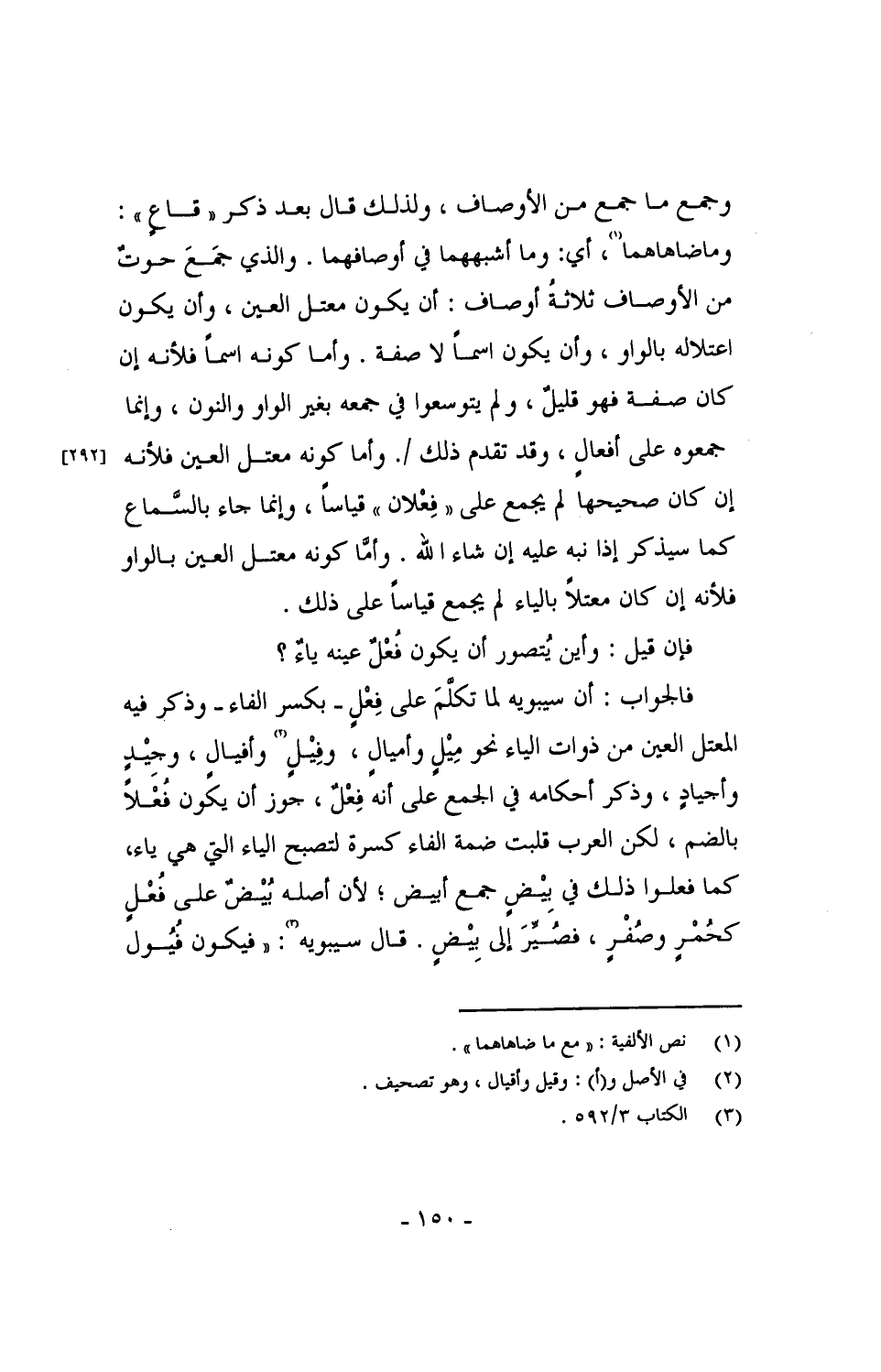فالجواب: أن سيبويه لما تكلَّم على فِعْلٍ - بكسر الفاء - وذكر فيه المعتل العين من ذوات الياء نحو مِيْلٍ وأميال، وفيل وأفيال، وجيد وأجياد، وذكر أحكامه في الجمع على أنه فِعْلٌ، جوز أن يكون فُعْلاً بالضم، لكن العرب قلبت ضمة الفاء كسرة لتصبح الياء التي هي ياء، كما فعلوا ذلك في بِيْضٍ جمع أبيض؛ لأن أصله بُيْضٌ على فُعْلٍ كحُمْرٍ وصُفْرٍ، فصُيِّرَ إلى بِيْضٍ. قال سيبويه: "فيكون فُيُول