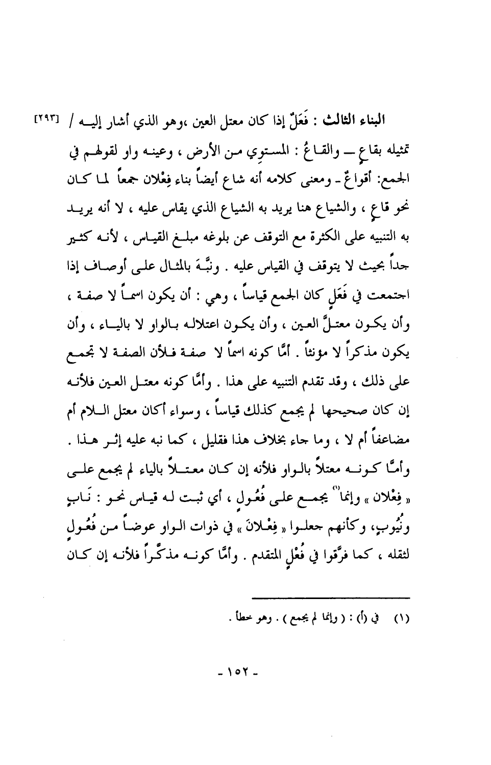 البناء الثالث: فَعَلٌ إذا كان معتل العينن وهو الذي أشار إليه / تمثيله بقاعٍ - والقاعُ: المستوي من الأرض، وعينه واو لقولهم في الجمع: أقواعٌ - ومعنى كلامه أن شاع أيضاً بناء فِعْلان جمعاً لما كان نحو قاعٍ، والشياع هنا يريد به الشياع الذي يقاس عليه، لا أنه يريد به التنبيه على الكثرة مع التوقف عن بلوغه مبلغ القياس، لأنه كثير جداً بحيث لا يتوقف في القياس عليه. ونبَّه بالمثال على أوصاف إذا اجتمعت في فَعَلٍ كان الجمع قياساً، وهي: أن يكون اسماً لا صفة، وأن يكون معتل العين، وأن يكون اعتلاله بالواو لا بالياء، وأن يكون مذكراً لا مؤنثاً. أما كونه اسماً لا صفة فلأن الصفة لا تجمع على ذلك، وقد تقدم التنبيه على هذا. وأما كونه معتل العين فلأنه إن كان صحيحها لم يجمع كذلك قياساً، وسواء أكان معتل العين اللام أم مضاعفاً أم لا، وما جاء بخلاف هذا فقليل، كما نبه عليه إثر هذا. وأما كونه معتلاً بالواو فلأنه إن كان معتلاً بالياء لم يجمع على "فِعْلان" وإنما يجمع على فُعُولٍ، أي ثبت له قياس نحو: نابٍ ونُيُوبٍ، وكأنهم جعلوا "فِعْلانَ" في ذوات الواو عوضاً من فُعُول لثقله، كما فرَّقوا في فُعْلٍ المتقدم. وأما كونه مذكراً فلأنه إن كان