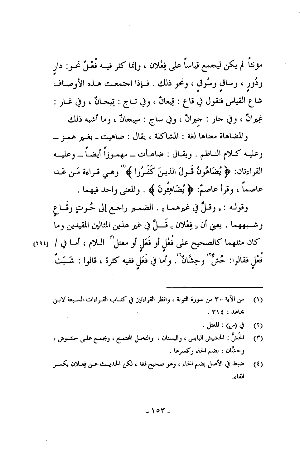 مؤنثاً لم يكن ليجمع قياساً على فِعْلان، وإنما كثر فيه فُعْلٌ نحو: دارٍ ودورٍ، وساقٍ وسُوقٍ، ونحو ذلك. فإذا اجتمعت هذه الأوصاف شاع القياس فتقول في قاع: قيعان، وفي تاج: تيجان، وفي غار: غِيران، وفي جار: جيران، وفي ساج: سِيجانٌ، وما أشبه ذلك.