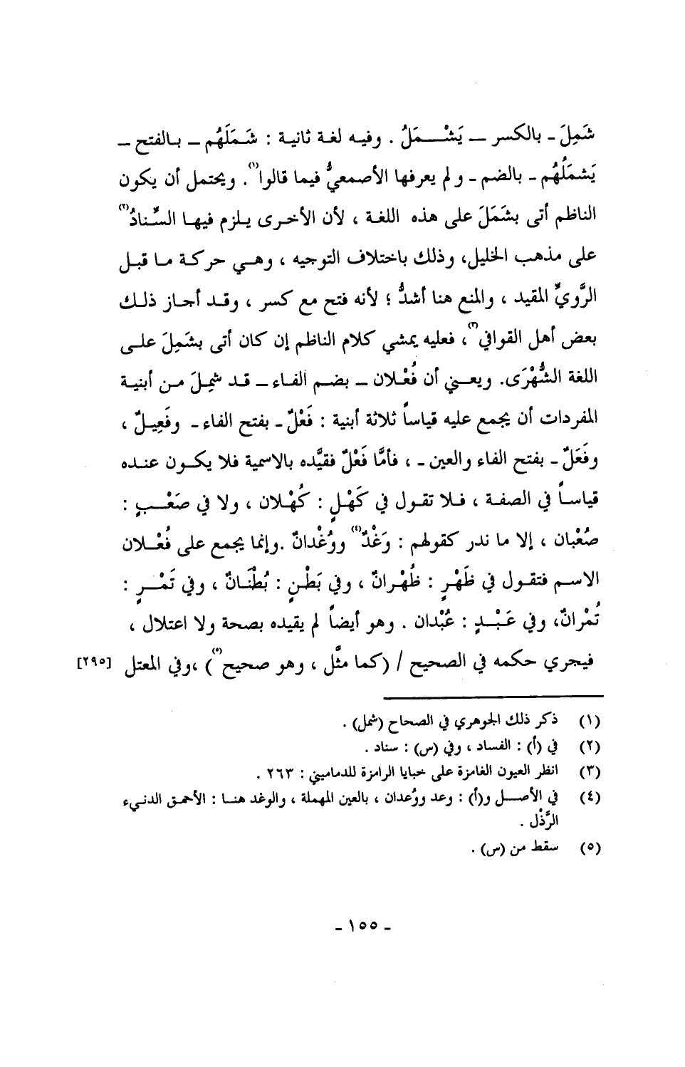 شَمِلَ - بالكسر - يَشْمَلُ. وفيه لغة ثانية: شَمَلَهُم - بالفتح - يَشمَلُهُم - بالضم - ولم يعرفها الأصمعي فيما قالوا. ويحتمل أن يكون الناظم أتى بشَمَلَ على هذه اللغة، لأن الأخرى يلز فيها السِّنادُ على مذهب الخليل، وذلك باختلاف بالتوجيه، وهي حركة ما قبل الرَّويِّ المقيد، والمنع هنا أشد؛ لأنه فتح مع كسر، وقد أجاز ذلك بعض أهل القوافي، فعليه يمشي كلام الناظم إن كان أتى بشَمِلَ من أبنية المفردات أن يجمع عليه قياساً ثلاثة أبنية: فَعْلٌ - بفتح الفاء وفَعِيلٌ، وفَعَلٌ - بفتح الفاء والعين -، فأما فَعْلٌ فقيَّده بالاسمية فلا يكون عنده قياساً في الصفة، فلا تقول في كَهْلٍ: كُهْلان، ولا في صَعْبٍ: صُعْبَان، إلا ما ندر كقولهم: وَغْدٌ ووُغْدانٌ. وإنما يجمع على فُعْلان الاسم فتقول في ظَهْرٍ: ظُهْران، وفي بَطْنٍ: بُطْنَانٌ. وفي تَمْرٍ: تُمْرانٌ، وفي عَبْدٍ: عُبْدان. وهو أيضاً لم يقيد بصحة واعتلال، فيجري حكمه في الصحيح / (كما مثَّل، وهو صحيح) وفي المعتل