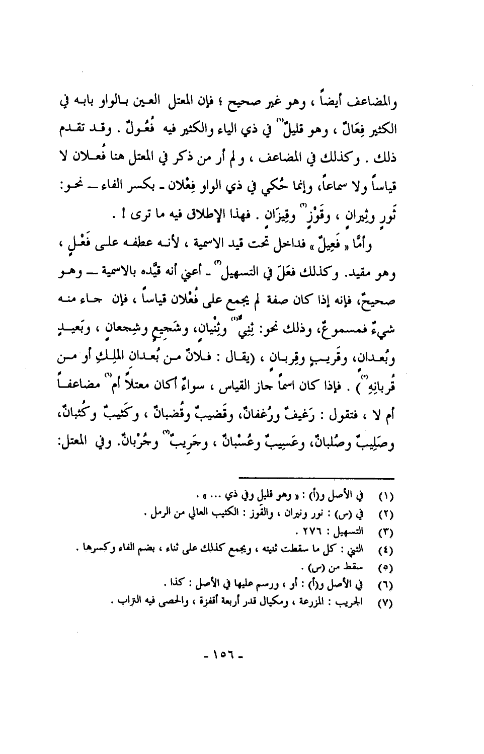 وأما "فَعيِلٌ" فداخل تحت قيد الاسمية، لأنه عطفه على فَعْلٍ، وهو مقيد. وكذلك فعَلَ في التسهيل - أعني أنه قيَّده بالاسمية - وهو صحيحٌ، فإنه إذا كان صفة لم يجمع على فُعْلان قياساً، فإن جاء منه شيءٌ فمسموعٌ، وذلك نحو: ثِنِيٍّ وثِنْيانٍ، وشَجيعٍ وشِجعانٍ، وبعيدٍ وبُعدانٍ، وقريبٍ قِربانٍ، (يقال: فلانٌ من بُعدانِ الملك أو من قربانه). فإذا كان اسماً جاز القياس، سواءٌ أكان معتلاً أم مضاعفاً أم لا، فتقول: رُغيفٌ ورُغفانٌ، وقضيبٌ وقُضبانٌ، وكثيب وكُثبانٌ، وصليبٌ وصُلبان، وعسيبٌ وعُسبان، وجريبٌ وجُربانٌ. وفي المعتل: