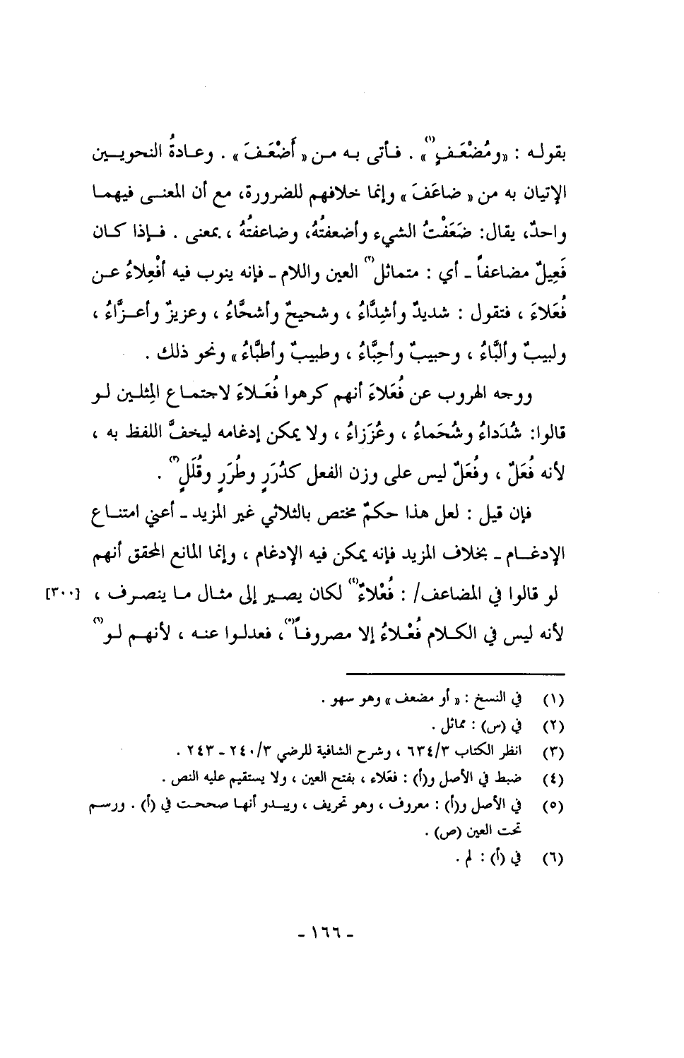 ووجه الهروب عن فُعَلاءَ أنهم كرهوا فُعَلاءَ لاجتماع المِثلين لو قالوا: شُدَداءُ وشُحَماءُ، وعُزَزاءُ، ولا يمكن إدغامه ليخفَّ اللفظ به، لأنه فُعَلٌ، وفُعَلٌ ليس على وزن الفعل كدُرَرٍ وطُرَرٍ وقُلُلٍ.