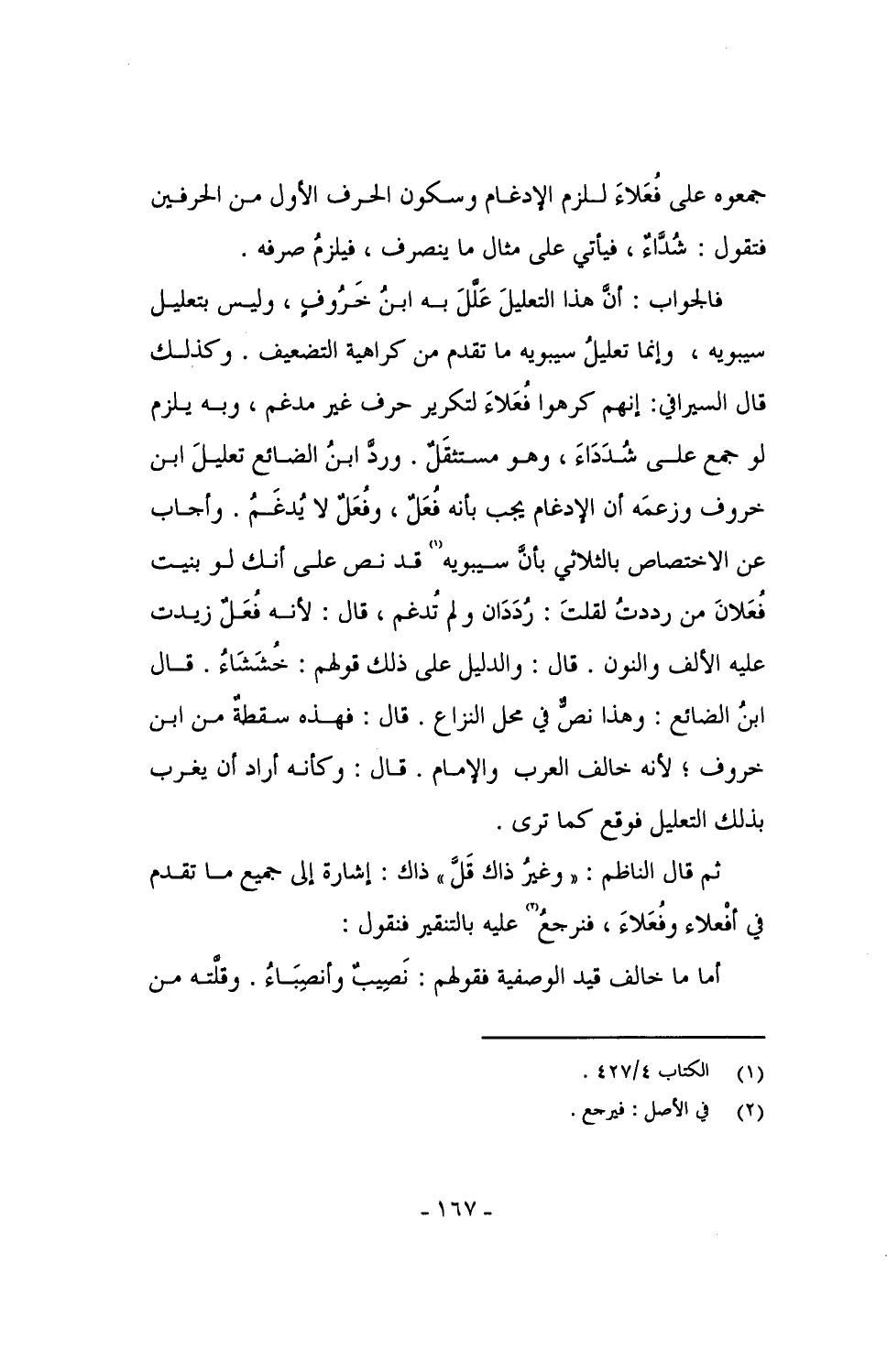 فالجواب: أنَّ هذا التعليل علَّلَ به ابن خروف، وليس بتعليل سيبويه، وإنما تعليلُ سيبويه ما تقدم من كراهية التضعيف. وكذلك قال السيرافي: أنهم رهوا فُعَلاءَ لتكرير حرف غير مدغم، وبه يلزم لو جمع على شُدَدَاءَ، وهو مستثقلٌ. وردَّ ابنُ الضائع تعليلَ ابن خروف وزعمه أن الإدغام يجب بأنه فُعَلٌ، وفُعَلٌ لا يُدغم. وأجاب عن الاختصاص بالثلاثي بأن سيبويه قد نص على أنك لو بنيت فُعَلانَ من رددتُ لقلتَ: رُدَدَان ولم تدغم، قال: لأنه فُعَلٌ زيدت عليه الألف والنون. قال: والدليل على ذلك قولهم: خُشَشَاءُ. قال ابن الضائع: وهذا نصٌّ في محل النزاع. قال: فهذه سقطةٌ من ابن خروف؛ لأنه خالف العرب والإمام. قال: وكأنه أراد أن يغرب بذلك التعليل فوقع كما ترى.