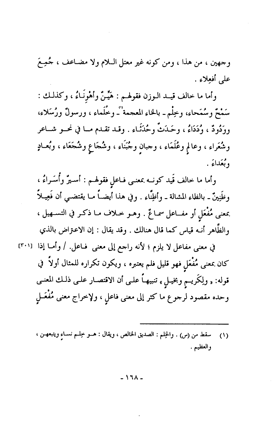 وأما ما خالف قيد الوزن فقولهم: هَيِّنٌ وأهْوِنَاءُ، وكذلك: سَمْحٌ وسُمَحاء، وخِلْم - بالخاء المعجمة - وخُلَماء، ورسولٌ ورُسَلاء، ووَدُودٌ، وُدَدَاءُ، وحَدَثٌ وحُدَثَاء. وقد تقدم في ما نحو شاعر وشعراء، وعالم وعلماء، وجبان وجبناء، وشُجَاعٍ وشُجَعَاء، وبُعادٍ وبُعَدَاءَ.
