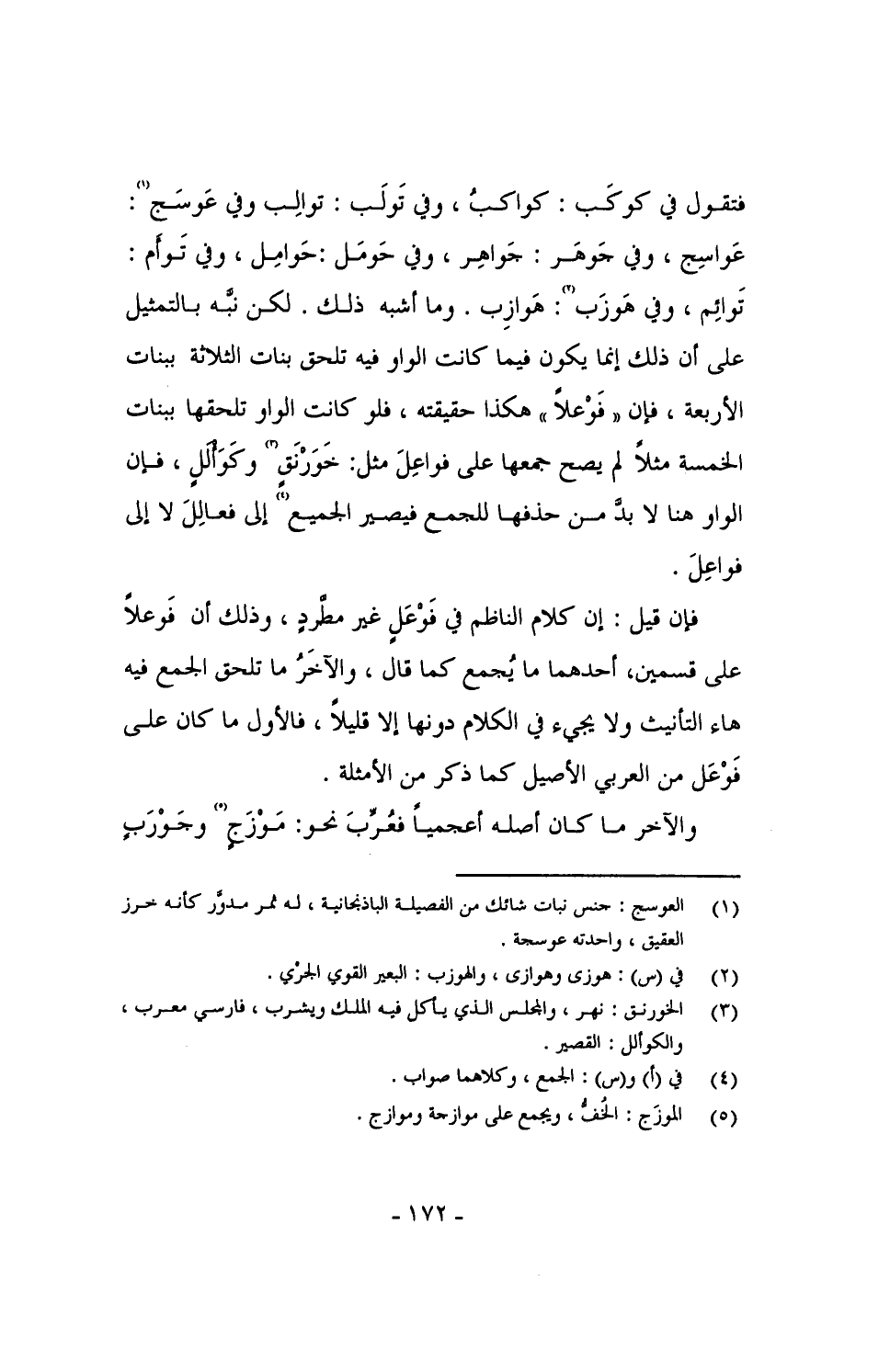 فتقول في كوكَب: كواكب، وفي تَولَب: توالِب، وفي عوسج: عواسِج، وفي جَوهَر: جَوَاهِر، وفي حَومَل: حَوَامِل، وفي توأم: توائِم، وفي هَوزَب: هَوازِب. وما أشبه ذلك. لكن نبَّه بالتمثيل على أن ذلك إنما يكون فيما كانت الواو تلحق بنات الثلاثة ببنات الأربعة، فإن "فَوْعلاً" هكذا حقيقته، فلو كانت الواو تلحقها ببنات الخمسة مثلا لم يصح جمعها على فواعِلَ مثل: خَوَرْنَق وكَوَأْلَلٍ، فإن الواو هنا لا بد من حذفها للجمع فيصير الجميع إلى فعالِلَ لا إلى فواعِلَ.