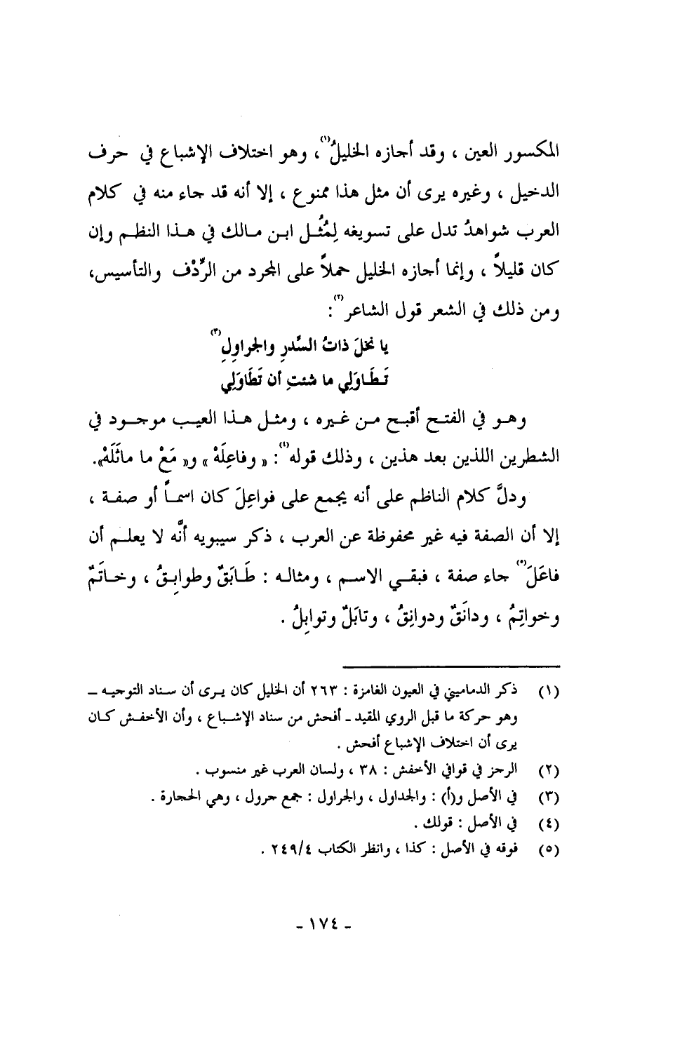المكسور العين، وقد أجازه الخليل، وهو اختلاف الإشباع في حرف الدخيل، وغيره يرى أن مثل هذا ممنوع، إلا أنه قد جاء منه في كلام العرب شواهدُ تدل على تسويغه لِمُثُل ابن مالك في هذا النظم وإن كان قليلاً، وإنما أجازه الخليل حملاً على المجرد من الرِّدْف والتأسيس، ومن ذلك في الشعر قول الشاعر: