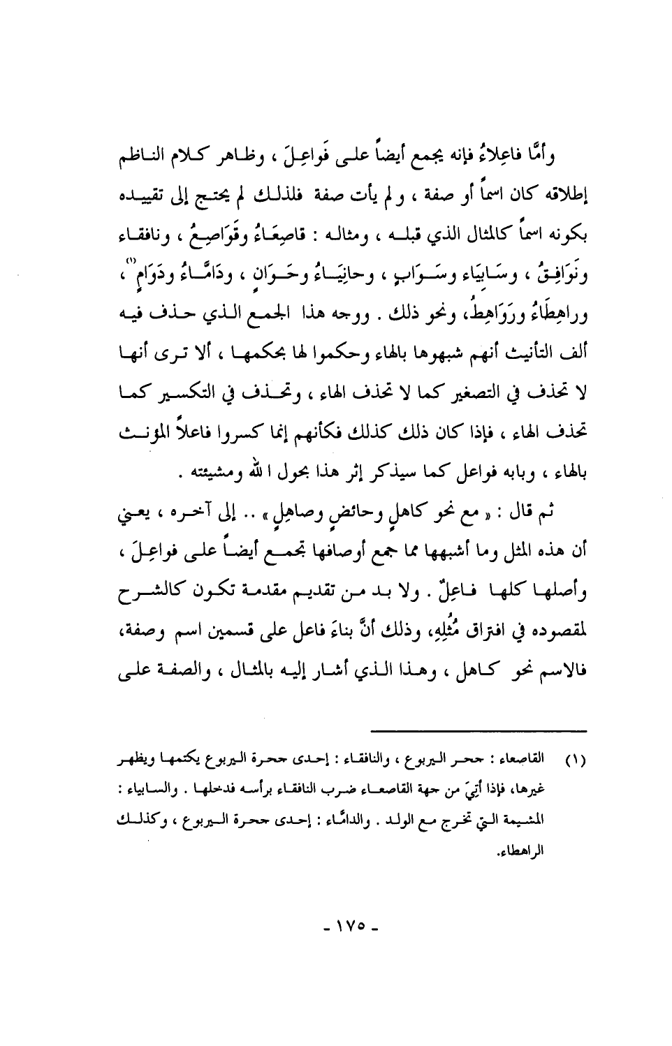 وأما فاعِلاء فإنه يجمع أيضاً على فَواعِلَ، وظاهر كلام الناظم إطلاقه كان اسماً أو صفة، ولم يأتي صفة فلذلك لم يحتج إلى تقييده بكوه اسماً كالمثال الذي قبله، ومثاله: قاصِعَاءُ وقَوَاصِعُ، ونافقاء ونَوَافِقُ، وسَابياء وسَوَاب، وحانِيَاءُ وحَوَانٍ، ودامَّاءُ ودَوَامٍ، وراهِطَاءُ ورَوَاهِطُ، ونحو ذلك. ووجه هذا الجمع الذي حذف فيه ألف التأنيث أنهم شبهوها بالهاء وحكموا لها بحكمها، ألا ترى أنها لا تحذف في التصغير كما لا تحذف الهاء، فإذا كان ذلك كذلك فكأنهم إنما كسروا فاعلاً المؤنث بالهاء، وبابه فواعل كما سيذكر إثر هذا بحول الله ومشيئته.