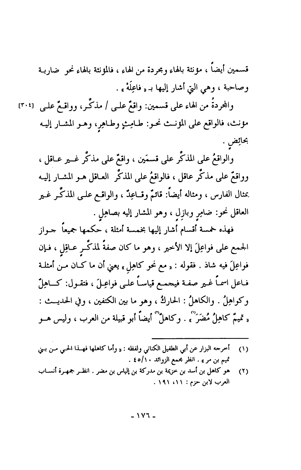 والواقعُ على المذكر على قسمين، واقعٌ على مذكر غير عاقل، وواقعٌ على مذكر عاقل، فالواقع على المذكر العاقل هو المشار إليه بمثال الفارس، ومثاله أيضاً: قائمٌ وقاعِدٌ، والواقع على المذكر غير العاقل نحو: ضامِرٍ وبازِلٍ، وهو المشار إليه بصاهلٍ.