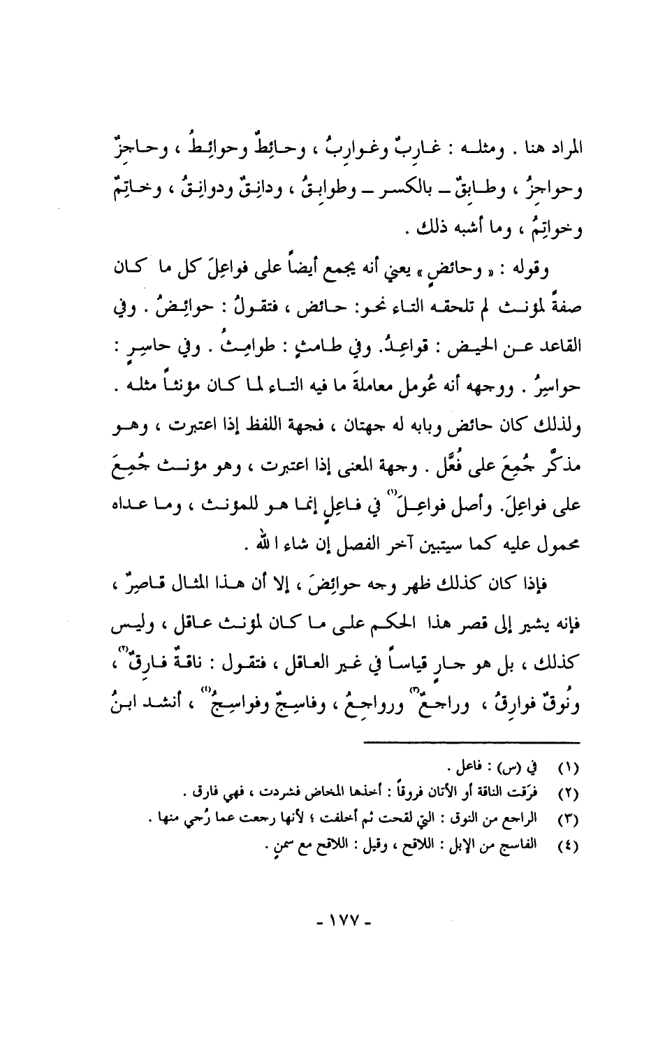 فإن كان كذلك ظهر وجه حوائِضَ، إلا أن هذا المثال قاصِرٌ، فإنه يشير إلى قصر هذا الحكم على ما كان لمؤنث عاقل، وليس كذلك، بل هو جارٍ قياساً في غير العاقل، فتقول: ناقةٌ فارِقٌ، ونوقٌ فوارِقُ، وراجعٌ ورواجِعُ، وفاسِجٌ وفواسِجُ، أنشد ابنُ