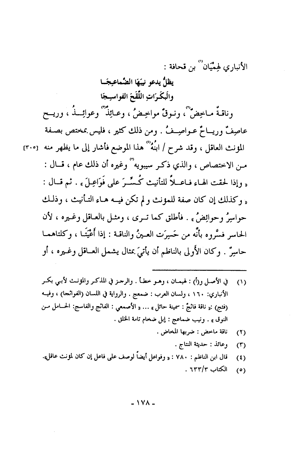 وناقةٌ ماخِضٌ، ونوقٌ مواخِضٌ، وعائذٌ وعوائِذُ، وريح عاصفٌ ورياحٌ عواصِفُ، ومن ذلك كثير، فليس بمختص بصفة المؤنث العاقل، وقد شرح / ابنُهُ هذا الموضع فأشار إلى ما يظهر منه من الاختصاص، والذي ذكر سيبويه وغيره أن ذلك عام، قال: "وإذا لحقت الهاء فاعلاً للتأنيث كُسِّرَ على فَوَاعِلَ". ثم قال: "وكذلك إن كان صفة للمؤنث ولم تكن فيه هاء التأنيث، وذلك حواسِرُ وحوائِضُ". فأطلق كما ترى، ومثل بالعاقل وغيره، لأن الحاسر فسَّروه بأنه من حَسِرَت العينُ والناقة: إذا اَعْيَتَا، ولكتاهما حاسِرٌ. وكان الأولى بالناظم أن يأتيَ بمثال يشمل العاقل وغيره، أو