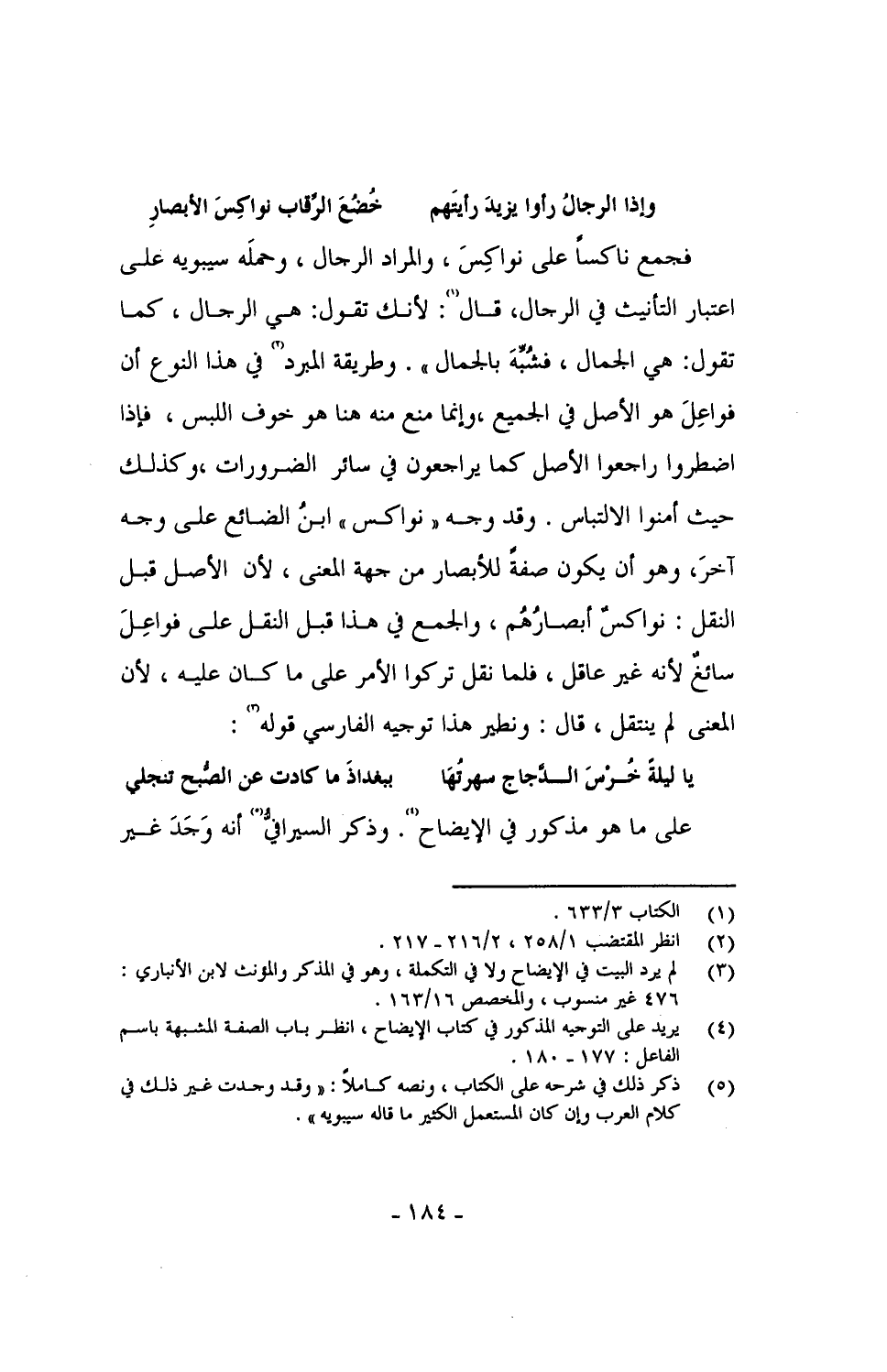 فجمع ناسكاً على نواكِسَ، والمراد الرجال، وحملَه سيبويه على اعتبار التأنيث في الرجال، قال: لأنك تقول: هي الرجال، كما تقول: هي الجمال، فشُبِّهَ". وطريقة المبرد في هذا النوع أن فواعِلَ هو الأصل في الجميع، وإنما منع منه هنا هو خوف اللبس، فإذا اضطروا راجعوا الأصل كما يراجعون في سائر الضرورات، وكذلك حيث أمنوا الالتباس. وقد وجه "نواكس" ابنُ الضائع على وجه آخرَ، وهو أن يكون صفةً للأبصار من جهة المعنى، لأن الأصل قبل النقل: نواكسٌ أبصارُهُم، والجمع في هذا قبل النقل على فواعل سائغ لأنه غير عاقل، فلما نقل تركوا الأمر على ما كان عليه، لأن المعنى لم ينتقل، قال: ونطير هذا توجيه الفارسي قوله: