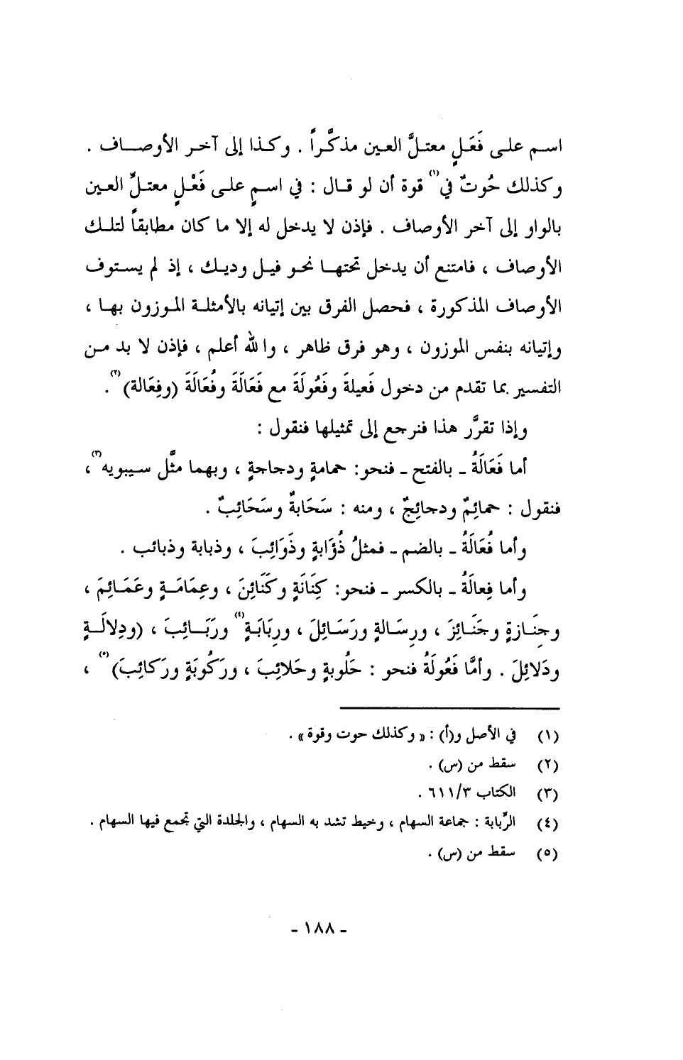 وأما فِعَالَةُ - بالكسر - فنحو: كِنَانَةٍ وكَنَائِنَ، وعمامة وعمائم، وجنازة وجنائز، ورسالة ورسائل، وربابة وربائب، (ودلالة ودلائل. وأما فَعُولَةُ فنحو: حَلُوبةٍ وحلائب، وركوبة وركائب)،
