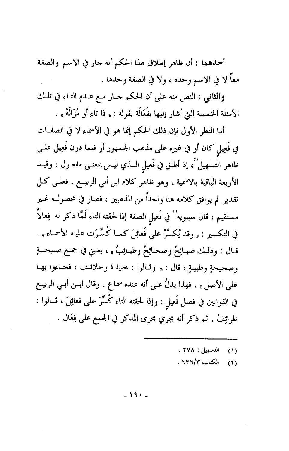 أما النظر الأول فإن ذلك الحكم إنما هو في الأسماء لا في الصفات في فَعِيلٍ كان أو في غيره على مذاهب الجمهور أو فيما دون فَعِيل على ظاهر التسهيل، إذ أطلق في فَعيل الذي ليس بمعنى مفعول، وقيد الأربعة الباقية بالاسمية، وهو ظاهر كلام ابن أبي الربيع. فعلي كل تقدير لم يوافق كلامه هنا واحداً من المذهبين، فصار في محصوله غير مستقيم، قال سيبويه في فَعيلٍ الصفة إذا لحقته التاء لمَّا ذكر له فِعالاً في التكسير: "وقد يُكسَّرُ على فَعائِلَ كما كسِّرت عليه الأسماء". قال: وذلك صبائح وصحائحُ وطبائب"، يعني في جمع صبيحةٍ وصحيحةٍ وطبيبةٍ، قال: "وقالوا: خليفة وخلائف، فجاءوا بها على الأصل". فهذا يدل على أنه عنده سماع. وقال ابن أبي الربيع في القوانين في فصل فَعيل: وإذا لحقته التاء كُسِّرَ على فعائِلَ، قالوا: ظرائِفُ. ثم ذكر أنه يجري مجرى المذكر في الجمع على فِعَال.