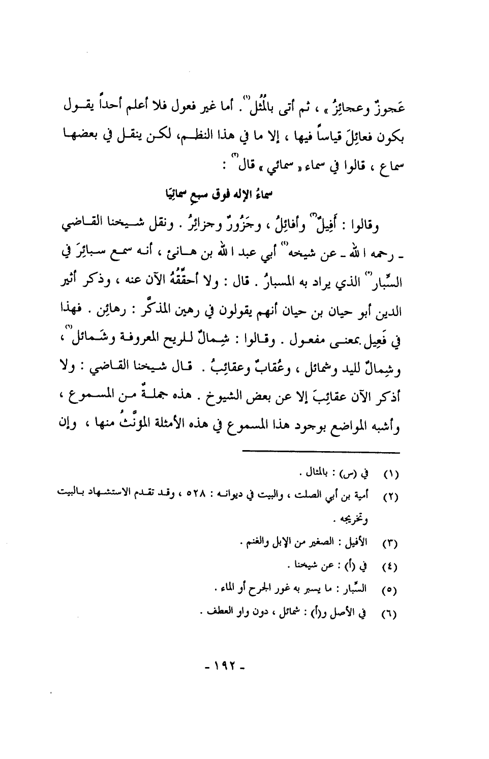 وقالوا: أفِيلٌ وأفائِلُ، وجَزورٌ وجزائِرُ. ونقل شيخنا القاضي - رحمه الله - عن شيخه أبي عبد الله بن هانئ، أنه سمع سبائِرَ في السبار الذي يراد به المسبار. قال: ولا أحققه الآن عنه، وذكر أثير الدين أبو حيان بن حيان أنهم يقولون في رهين المذكر: رهائِن. فهذا في فَعِيل بمعنى مفعول. وقالوا: شِمالٌ للريح المعروفة وشَمائل، وشِمالٌ لليد وشمائل، وعُقابٌ وعقائِبُ. قال شيخنا القاضي: ولا أذكر الآن عقائِبَ إلا عن بعض الشيوخ. هذه جملة من المسموع، وأشبه المواضع بوجود هذا المسموع في هذه الأمثلة المؤنَّثُ منها، وإن