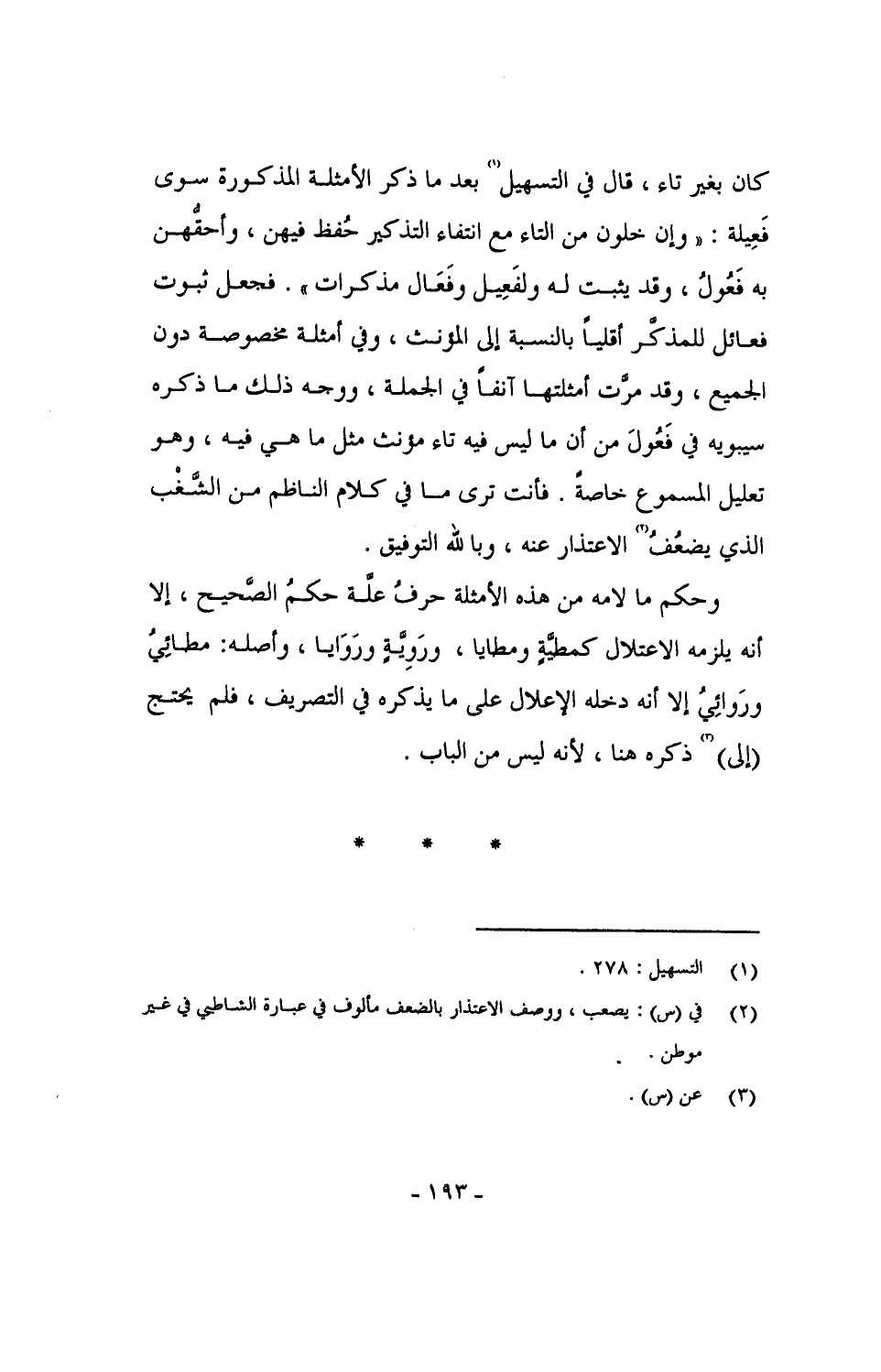 كان بغير تاء، في التسهيل بعد ما ذكر الأمثلة المذكورة سوى فَعيلة: "وإن خلون من التاء مع انتفاء التذكير حفظ فيهن، وأحقُّهن به فَعُولُ، وقد يثبت له ولفَعيِل وفَعَال مذكرات". فجعل ثبوت فعائل للمذكر أقلياً بالنسبة إلى المؤنث، وفي أمثلة مخصوصة دون الجميع، وقد مرَّت أمثلتها آنفاً في الجملة، ووجه ذلك ما ذكره سيبويه في فَعُولَ من أن ما ليس فيه تاء مؤنث مثل ما هي فيه، وهو تعليل المسموع خاصةً. فأنت ترى ما في كلام الناظم من الشَّغْب الذي يضعُفُ الاعتذار عنه، وبالله التوفيق.