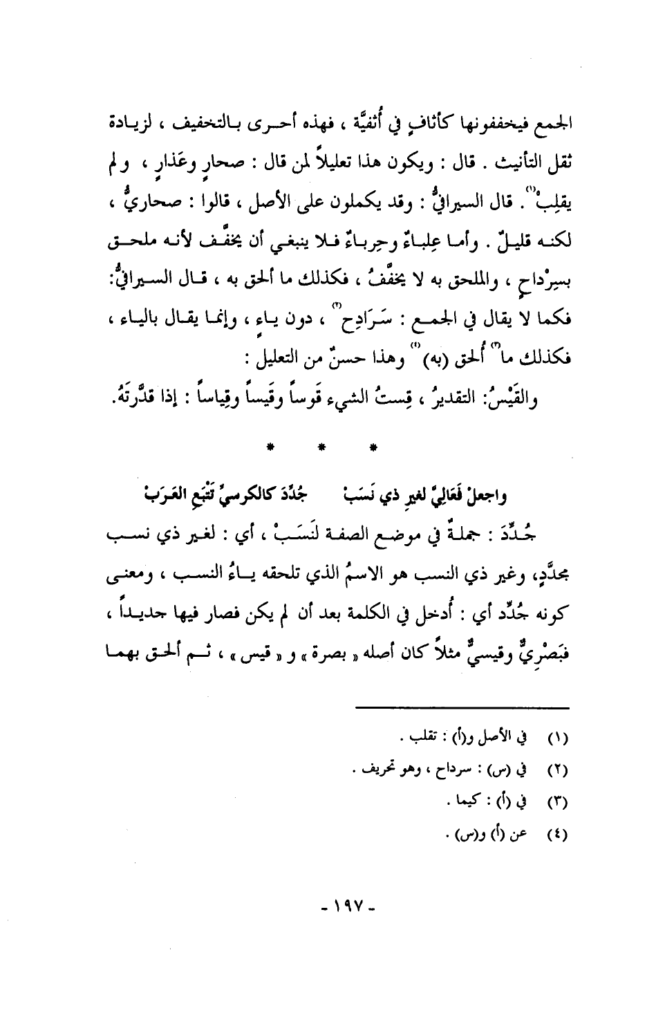 الجمع فيخففونها كأثافٍ في أُثفيَّة، فهذه أحرى بالتخفيف، لزيادة ثقل التأنيث. قال: ويكون هذا تعليلاً لمن قال: صحارٍ وعَذارٍ، ولم يقلِبْ. قال السيرافي: وقد يكملون على الأصل، قالوا: صحاريُّ، لكنه قليل. وأما عِلباءٌ وحِرباءٌ فلا ينبغي أن يخفف لأنه ملحق بسِرْداحٍ، والملحق به لا يخفَّفُ، فكذلك ما ألحق به، قال السيرافي: فكما لا يقال في الجمع: سَرَادِح، دون ياءٍ، وإنما يقال بالياء، فكذلك ما ألحق (به) وهذا حسنٌ من التعليل: