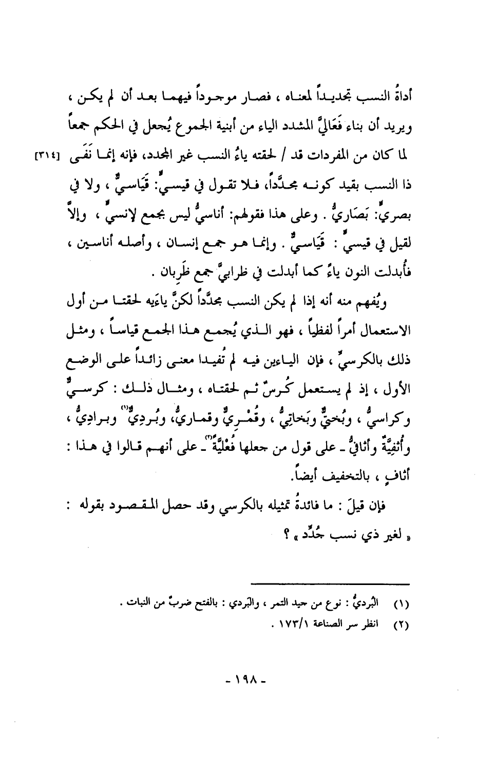 ويُفهم منه إذا لم يكن النسب مجدَّداً لكنَّ ياءَيه لحقتا من أول الاستعمال أمراً لفظياً، فهو الذي يُجمع هذا الجمع قياساً، ومثل ذلك بالكرسيِّ، فإن الياءين فيه لم تُفيدا معنى زائداً على الوضع الأول، إذ لم يستعمل كُرسٌ ثم لحقتاه، ومثال ذلك: كرسيٌّ وكراسيُّ، وبُختيٌّ وبَخاتِيُّ، وقُمْرِيٌّ وقماريُّ، وبُردِيٌّ وبرادِيُّ، وأُثفِيَّةٌ وأثافيُّ - على قول من جعلها فُعْليَّةً - على أنهم قالوا في هذا: أثافٍ، بالتخفيف أيضاً.