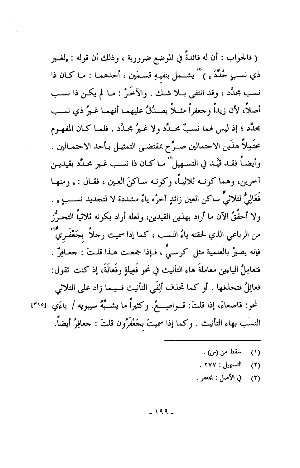 (فالجواب: أن له فائدةً في الموضع ضرورية، وذلك أن قوله: "لغير ذي نسبٍ جُدِّدَ") يشمل بنفيِهِ قسمين، أحدهما: ما كان ذا نسب مجدَّد، وقد انتفى بلا شك. والآخر: ما لم يكن ذا نسب أصلاً، لأن زيداً وجعفراً مثلاً يصدُقُ عليهما أنهما غيرُ ذي نسب مجدَّد؛ إذ ليس لهما نسبٌ مجدَّد ولا غيرُ مجدَّد. فلما كان المفهوم هذين الاحتمالين صرَّح بمقتضى التمثيل بأحد الاحتمالين. وأيضاً فقد قيَّد في التسهيل ما كان ذا نسب غير مجدَّد بقيدين آخرين، وهما كونه ثلاثياً، وكونه ساكنَ العين، فقال: "ومنها فَعَالِيُّ لثلاثيٍّ ساكن العين زائدٍ آخره ياءٌ مشددة لا لتجديد نسبٍ". ولا أحقِّقُ الآن ما أراد بهذين القيدين، ولعله أراد بكونه ثلاثياً التحرُّز من الرباعي الذي لحقته ياءُ النسب، كما إذا سميت رجلاً بِجَعْفريٍّ فإنه يصير بالعلمية مثل كرسيٍّ، فإذا جمعت هذا قلتَ: جعافِرٌ. فتعامِلُ الياءين معاملةَ هاء التأنيث في نحو فَعِيلةٍ وفَعَالَةَ، إذ كنت تقول: فعائِلُ فتحذفها. أو كما تحذف ألِفَي التأنيث فيما زاد على الثلاثي نحو: قاصعاءَ، إذا قلتَ: قواصِعُ. وكثيراً ما يشبِّهُ سيبويه / ياءي النسب بهاء التأنيث. وكما إذا سميتَ بجعْفَرُون قلتَ: جعافِرُ أيضاً.