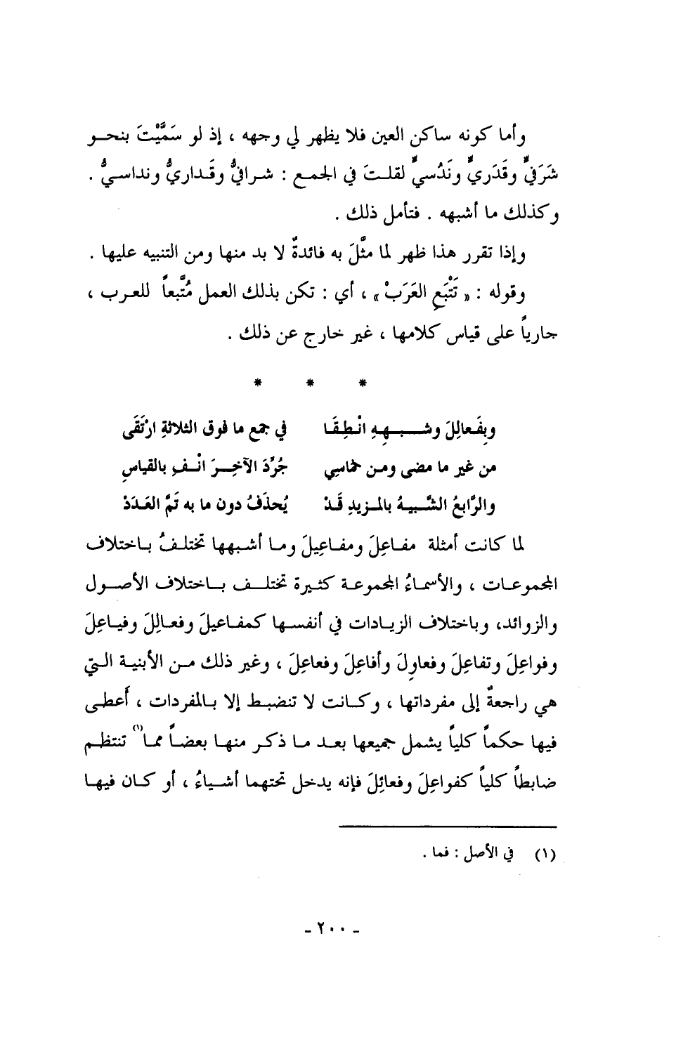 لما كانت أمثلة مفاعِلَ ومفاعِيلَ وما أشبهها تختلفُ باختلاف المجموعات، والأسماء المجموعة كثيرة تختلف باختلاف الأصول والزوائد، وباختلاف الزيادات في أنفسها كمفاعيلَ وفعالِلَ وفياعِلَ وفواعِلَ وتفاعِلَ وفعاوِلَ وأفاعِلَ وفعاعِلَ، وغير ذلك من الأبنية التي هي راجعةٌ إلى مفرداتها، وكانت لا تنضبط إلا بالمفردات، أعطى فيها حكماً كلياً يشمل جميعها بعد ما ذكر منها بعضاً مما تنتظم ضابطاً كلياً كفواعِلَ وفعائِلَ فإنه يدخل تحتهما أشياءٌ، أو كان فيها