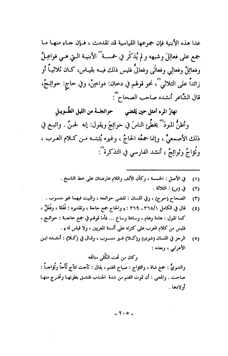 عدا هذه الأبنية فإن جموعها القياسية قد تقدمت، فإن جاء منها ما جمع على فعالِلَ وشبهه ولم يُذكر في خمسة الأبنية التي هي فواعِلُ وفعالِلُ وفعالَى وفعالىُّ فليس ذلك فيه بقياس، كان ثلاثياً أو زائداً على الثلاثي، نحو قولهم في دخان: دواخِنُ، وفي حاجٍ: حوائِجُ، قال الشاعر أنشده صاحب الصحاح: