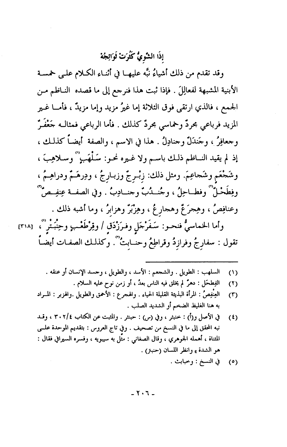 وأما الخماسيُّ فنحو: سَفَرْجَلٍ وفرزْدَقٍ / وقِرْطَعْبٍ وحِنْبَتْرٍ، تقول: سفارِجُ وفرازِدُ وقراطِعُ وحنابِتُ. وكذلك الصفات أيضاً