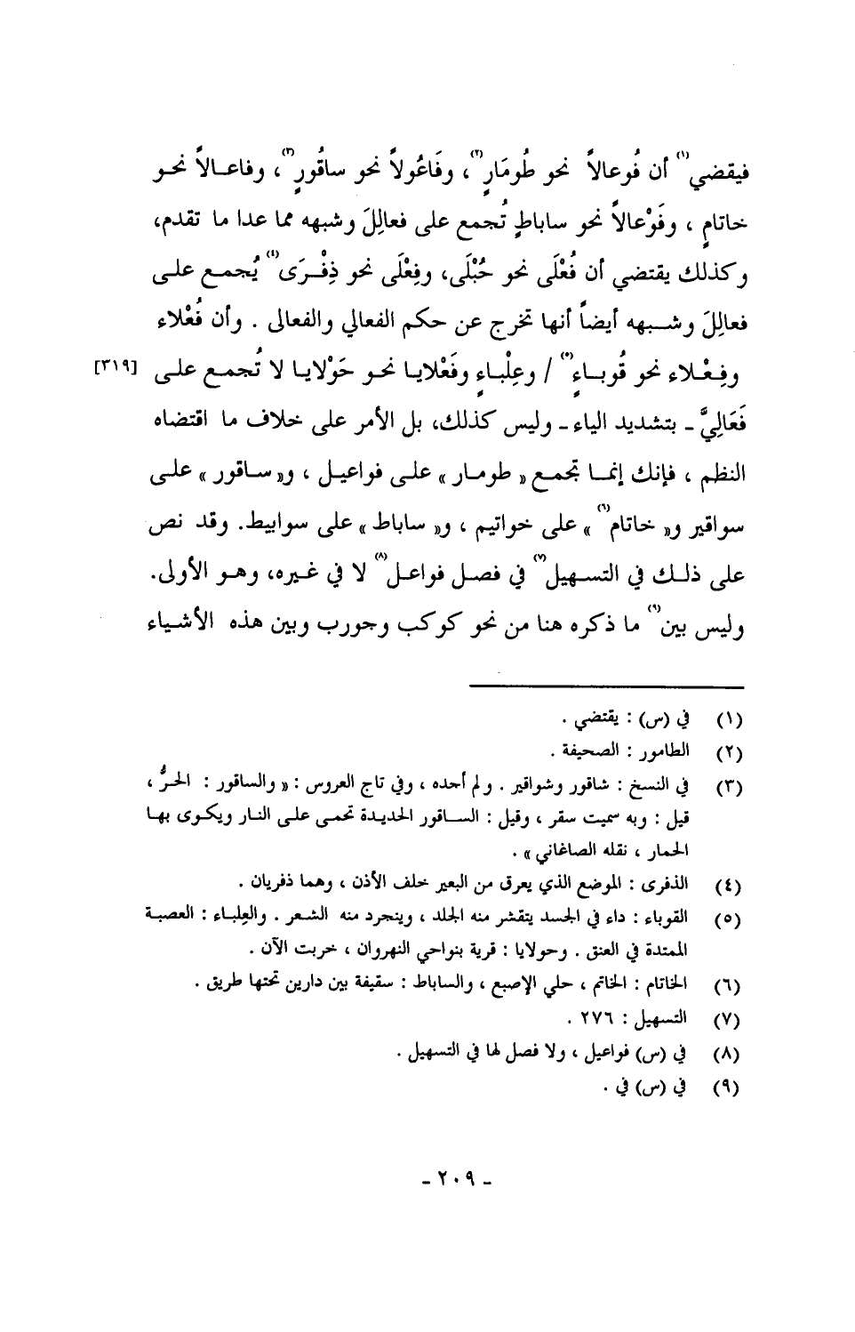 فيقضي أن فُوعالاً نحو طًومَارٍ، وفَاعُولاً نحو ساقُورٍ، وفاعالاً نحو خاتامٍ، وفَوْعالاً نحو ساباطٍ تُجمع على فعالِلَ وشبهه مما عدا ما تقدم، وكذلك يقتضي أن فُعْلَى نحو حُبْلَى، وفِعْلَى نحو ذِفْرَى يجمع على فعالِلَ وشبهه أيضاً أنها تخرج عن حكم الفعالي والفعالى. وأن فُعْلاء وفِعْلا نحو قُوباءٍ / وعِلْباء وفَعْلايا نحو حَوْلايا لا تُجمع على فَعَالِيَّ - بتشديد الياء - وليس كذلك، بل الأمر على خلاف ما اقتضاه النظم، فإنك إنما تجمع "طومار" على فواعيل، و"ساقور" على سواقير و"خاتام" على خواتيم و"ساباط" على سوابيط. وقد نص على ذلك في التسهيل في فصل فواعل لا في غيره، وهو الأولى. وليس بين ما ذكره هنا من نحو كوكب وجورب وبين هذه الأشياء