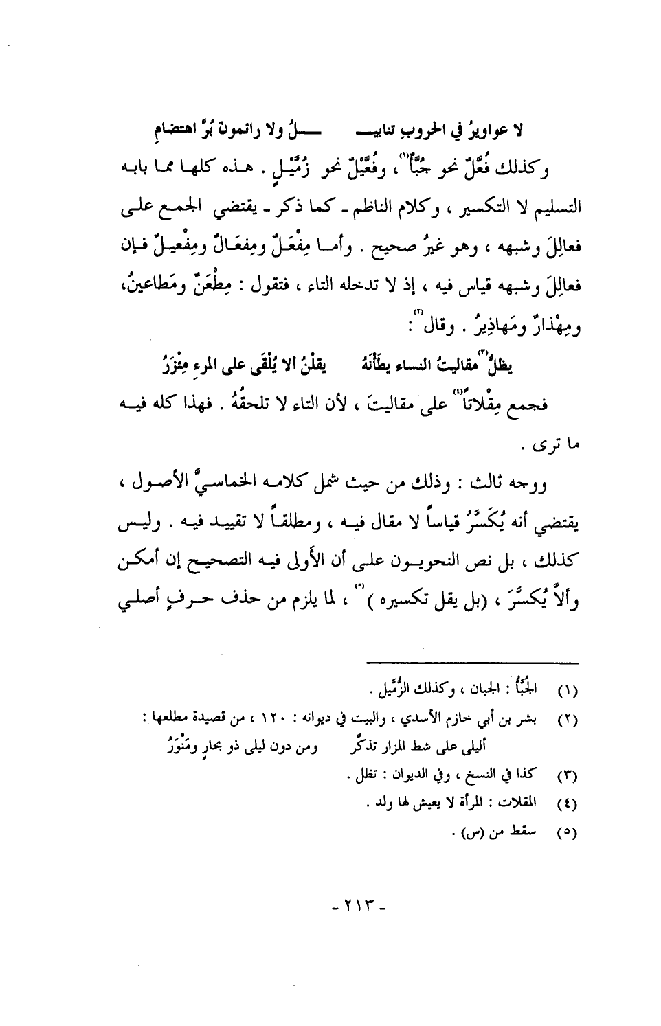 ووجه ثالث: وذلك من حيث شمل كلامه الخماسيَّ الأصول، يقتضي أنه يُكَسَّرُ قياساً لا مقال فيه، ومطلقاً لا تقييد فيه. وليس كذلك، بل نص النحويون على أن الأولى فيه التصحيح إن أمكن وألاَّ يُكسَّرَ، (بل يقل تكسيره)، لما يلزم من حذف حرفٍ أصلي