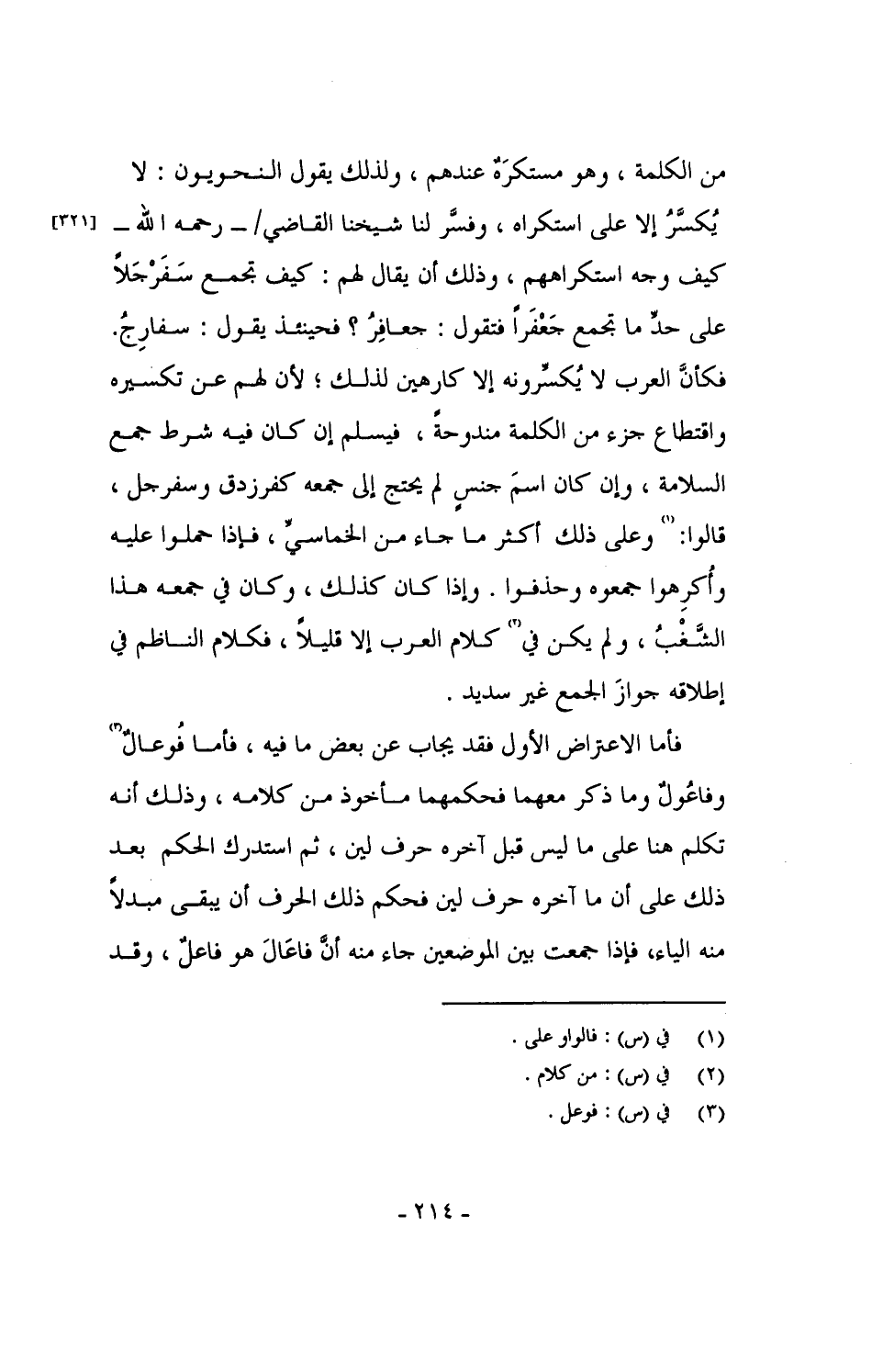 من الكلمة، وهو مستكرَهٌ عندهم، ولذلك يقول النحويون: لا يُكسَّرُ إلا على استكراه، وفسَّر لنا شيخنا القاضي / - رحمه الله - كيف وجه استكراههم، وذلك أن يقال لهم: كيف تجمع سَفَرْجَلاً على حدِّ ما تجمع جَعْفَراً فتقول: جعافِرُ؟ فحينئذ يقول: سفارِجُ. فكأنَّ العرب لا يُكسِّرونه إلا كارهين لذلك؛ لأنه لهم عن تكسيره واقتطاع جزء من الكلمة مندوحةً، فيسلم إن كان فيه شرط جمع السلامة، وإن كان اسمَ جنسٍ لم يحتج إلى جمعه كفرزدق وسفرجل، قالوا: وعلى ذلك أكثر ما جاء من الخماسيِّ، فإذا حملوا عليه وأُكرِهوا جمعوه وحذفوا. وإذا كان كذلك، وكان في جمعه هذا الشَّغْبُ، ولم يكن في كلام العرب إلا قليلاً، فكلام الناظم في إطلاقه جوازَ الجمع غير سديد.