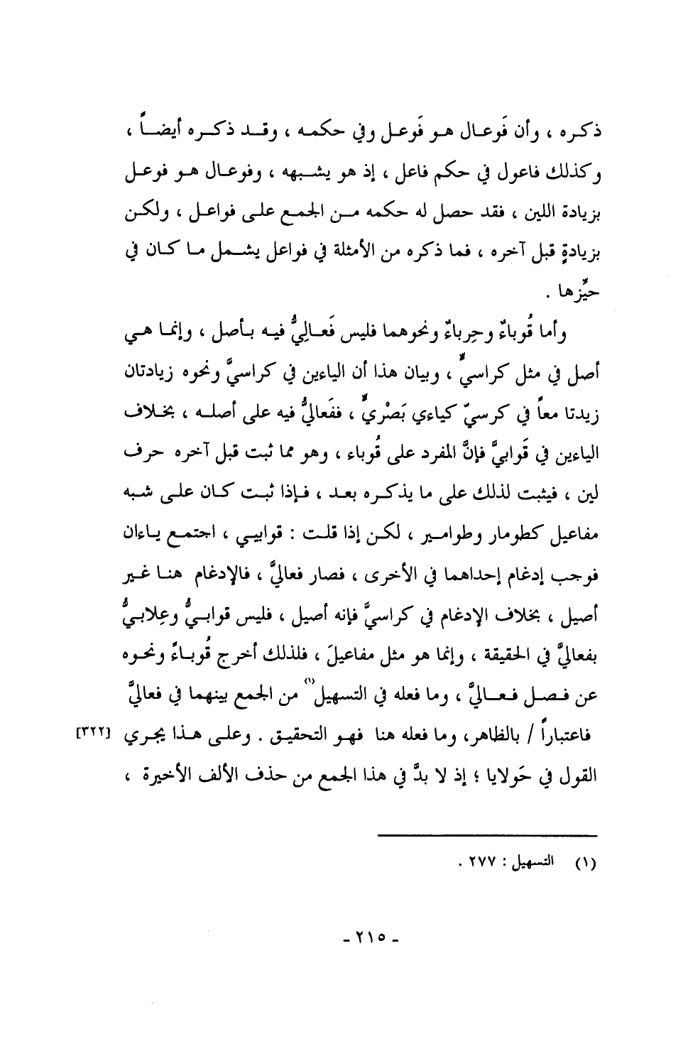 وأما قُوباءٌ وحِرباءٌ ونحوهما فليس فَعالِيُّ فيه بأصل، وإنما هي أصل في مثل كراسيٍّ، وبيان هذا أن الياءين في كراسيَّ ونحوه زيادتان زيدتا معاً في كرسيّ كياءي بَصْريٍّ، ففَعاليُّ فيه على أصله، بخلاف الياءين في قَوابيَّ فإنَّ المفرد على قُوباء، وهو مما ثبت قبل آخره حرف لين، فيثبت لذلك على ما يذكر بعد، فإذا ثبت كان على شبه مفاعيل كطومار وطوامير، لكن إذا قلت: قوابيي، اجتمع ياءان فوجب إدغام إحداهما بالأخرى، فصار فعاليَّ، فالإدغام هنا غير أصيل، بخلاف الإدغام في كراسيَّ فإنه أصيل، فليس قوابيُّ وعِلابيُّ بفعاليَّ في الحقيقة، وإنما هو مثل مفاعيلَ، فلذلك أخرج قُوباءً ونحوه عن فصل فعاليَّ، وما فعله في التسهيل من الجمع بينهما في فعاليَّ فاعتباراً / بالظاهر، وما فعله هنا فهو التحقيق. وعلى هذا يجري القول في حَولايا؛ إذ لا بدَّ في هذا الجمع من حذف الألف الأخيرة،