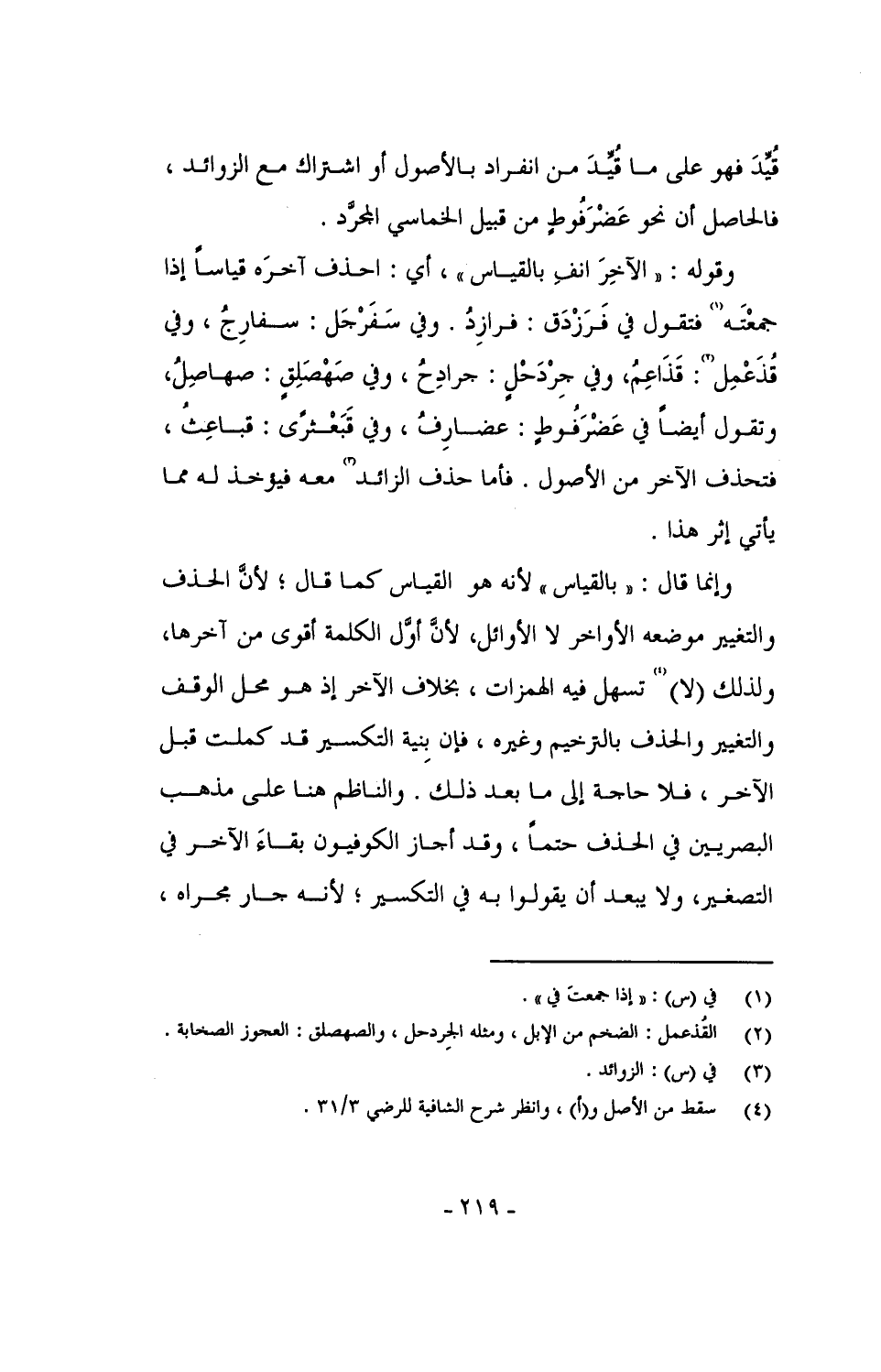وقوله: "الآخرَ انفِ بالقياس"، أي: احذف آخره قياساً إذا جمعته فتقول في فرزدق: فرازِدُ. وفي سفرجل: سفارِجُ، وفي قُذْعْمِل: قَذَاعِمُ، وفي جِرْدَحْلٍ: جرادِحُ، وفي صَهْصَلِقٍ: صهاصِلُ، وتقول أيضاً في عَضْرَفُوطٍ: عضارِفُ، وفي قَبَعْثرًى: قباعِثُ، فتحذف الآخر من الأصول. فأما حذف الزائد معه فيؤخذ له مما يأتي إثر هذا.
