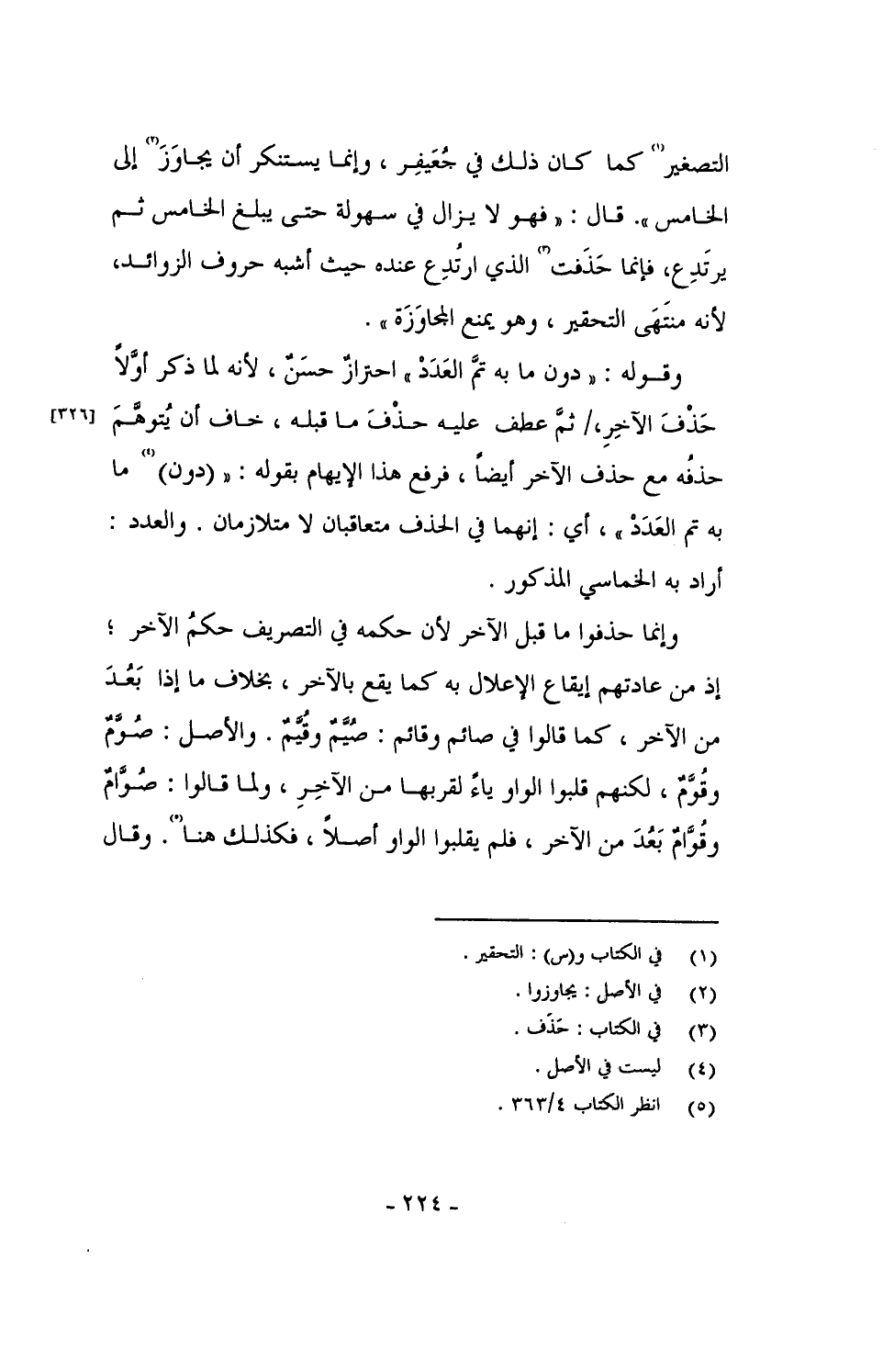 التصغير كما كان ذلك في جُعَيْفِر، وإنما يستنكر أن يجاوَزَ إلى الخامس". قال: "فهو لا يزال في سهولة حتى يبلغ الخامس ثم يرتَدِع، فإنما حَذَفت الذي ارتُدِع عنده حيث أشبه حروف الزوائد، لأنه منتهى التحقير، وهو يمنع المجاوَزَة".