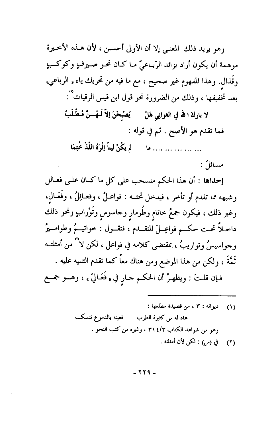 وهو يريد ذلك المعنى إلا أن الأولى أحسن، لأن هذه الأخيرة موهمة أن يكون أراد بزائد الرباعي ما كان نحو صيرفٍ وكوكبٍ وقذالٍ. وهذا المفهوم غير صحيح، مع ما فيه من تحريك ياء" الرباعي" بعد تخفيفها، وذلك من الضرورة نحو قول ابن قيس الرقيات: