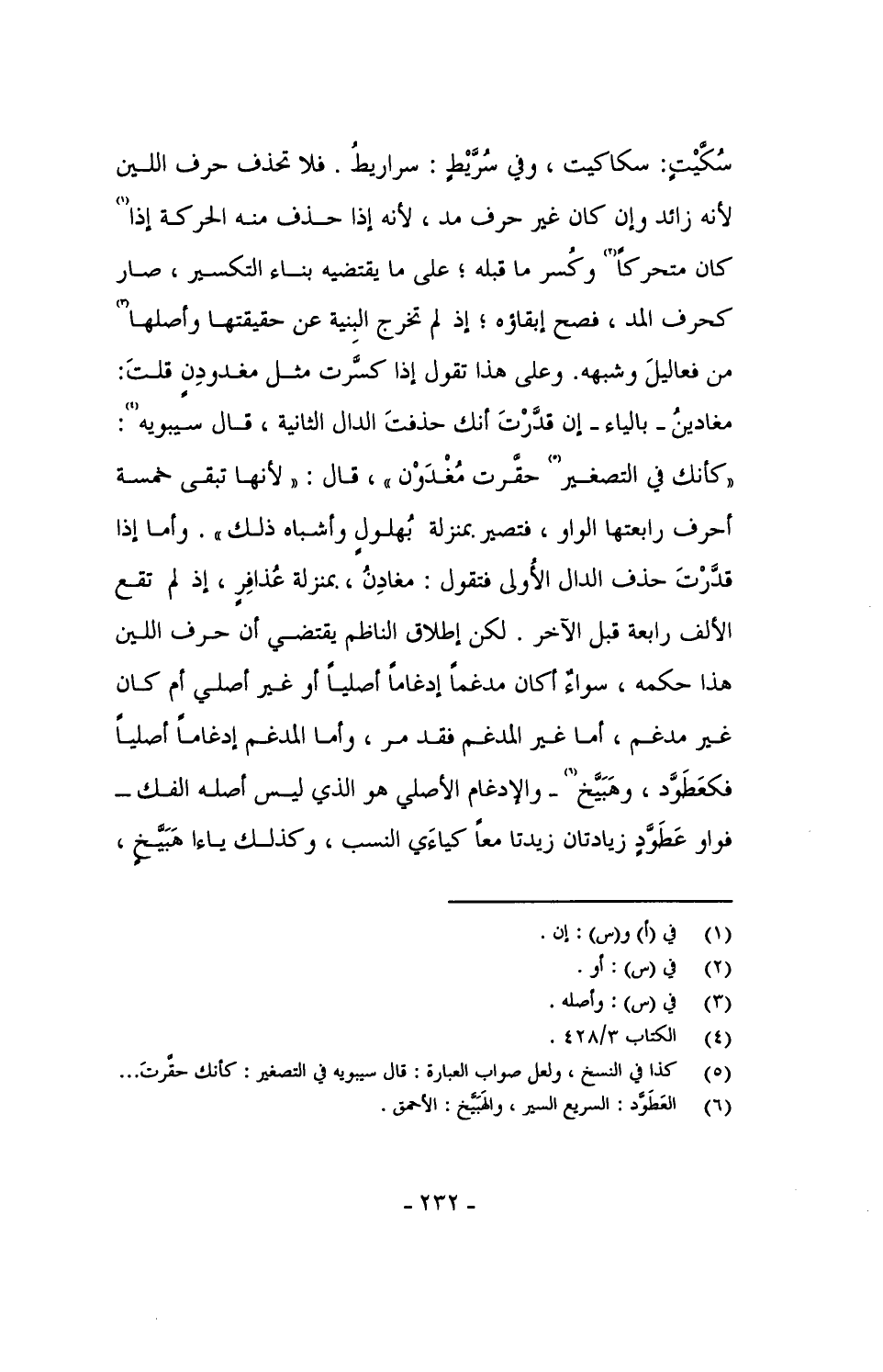سُكَّيْتٍ: سكاكيت، وفي سُرَّيْطٍ: سراريط. فلا تحذف حرف اللين لأنه زائد وإن كان غير حرف مد، لأنه إذا حذف منه الحركة إذا كان متحركاً وكسر ما قبله؛ على ما يقتضيه بناء التكسير، صار كحرف مد، فصح إبقاؤه؛ إذ لم تخرج البنية عن حقيقتها وأصلها من فعاليلَ وشبهه. وعلى هذا تقول إذا كسَّرت مثل مغدودِنٍ قلتَ: مغادينُ - بالياء - إن قدَّرْتَ أنك حذفت الدال الثانية، قال سيبويه: "كأنك في التصغير حقَّرت مُغْدَوْن"، قال: "لأنها تبقى خمسة أحرف رابعتها الواو، فتصير بمنزلة بُهلولٍ وأشباه ذلك". وأما إذا قدَّرتَ حذف الدال الأولى فتقول: مغادِنُ، بمنزلة عُذافِرٍ، إذ لم تقع الألف رابعة قبل الآخر. لكن إطلاق الناظم يقتضي أن حرف اللين هذا حكمه، سواءً أكان مدغماً إدغاماً أصلياً أو غير أصلي أم كان غير مدغم، أما غير المدغم فقد مر، وأما المدغم إدغاماً أصلياً فكعَطَوَّد، وهَبَيَّخ - والإدغام الأصلي هو الذي ليس أصله الفك - فواو عَطَوَّدٍ زيادتان زيدتا معاً كياءَي النسب، وكذلك ياءا هَبَيَّخٍ،