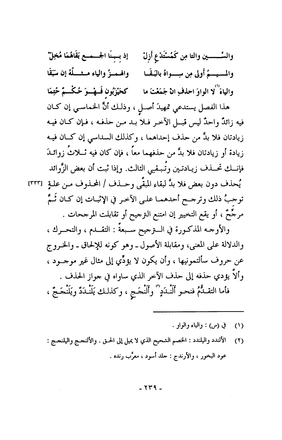 والأوجه المذكورة في الترجيح سبعة: التقدم، والتحرك، والدلالة على المعنى، ومقابلة الأصول - وهو كونه للإلحاق - والخروج عن حروف سألتمونيها، وأن يكون لا يؤدِّي إلى مقال غير موجود، وألا يؤدي حذفه إلى حذف الآخر الذي ساواه في جواز الحذف.