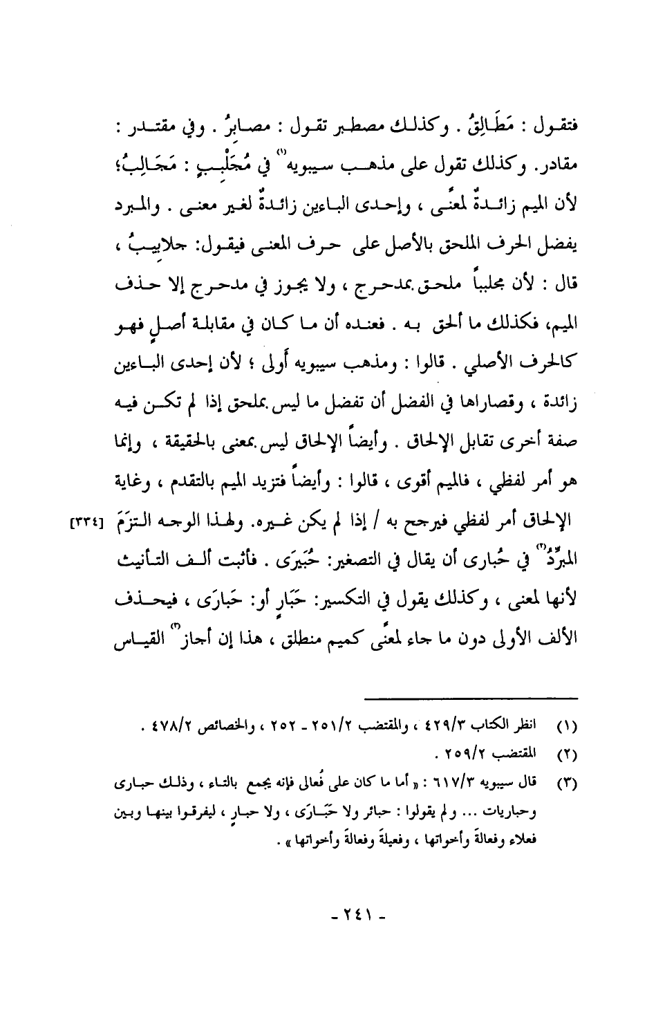 فتقول: مَطَالِقُ. وكذلك مصطبر تقول: مصابِرُ. وفي مقتدر: مقادر. وكذلك تقول على مذهب سيبويه في مُجَلْبِبٍ: مَجَالِبُ؛ لأن الميم زائدةٌ لمعنًى، وإحدى الباءين زائدةٌ لغير معنى. والمبرد يفضل الحرف الملحق بالأصل على حرف المعنى فيقول: جلابيبُ، قال: لأن مجلبباً ملحق بمدحرج، ولا يجوز في مدحرج إلا حذف الميم، فكذلك ما ألحق به. فعنده أن ما كان في مقابلة أصلٍ فهو كالحرف الأصلي. قالوا: ومذهب سيبويه أولى؛ لأن إحدى الباءين زائدة، وقصاراها في الفضل أن تفضل ما ليس بملحق إذا لم تكن فيه صفة أخرى تقابل الإلحاق. وأيضاً الإلحاق ليس بمعنى بالحقيقة، وإنما هو أمر لفظي، فالميم أقوى، قالوا: وأيضاً فتزيد الميم بالتقدم، وغاية الإلحاق أمر لفظي فيرجح به / إذا لم يكن غيره. ولهذا الوجه التزَمَ المبرِّدُ في حُبارى أن يقال في التصغير: حُبَيرَى. فأثبت ألف التأنيث لأنها لمعنى، وكذلك يقول في التكسير: حَبَارٍ أو: حَبارَى، فيحذف الألف الأولى دون ما جاء لمعنًى كميم منطلق، هذا إن أجاز القياس