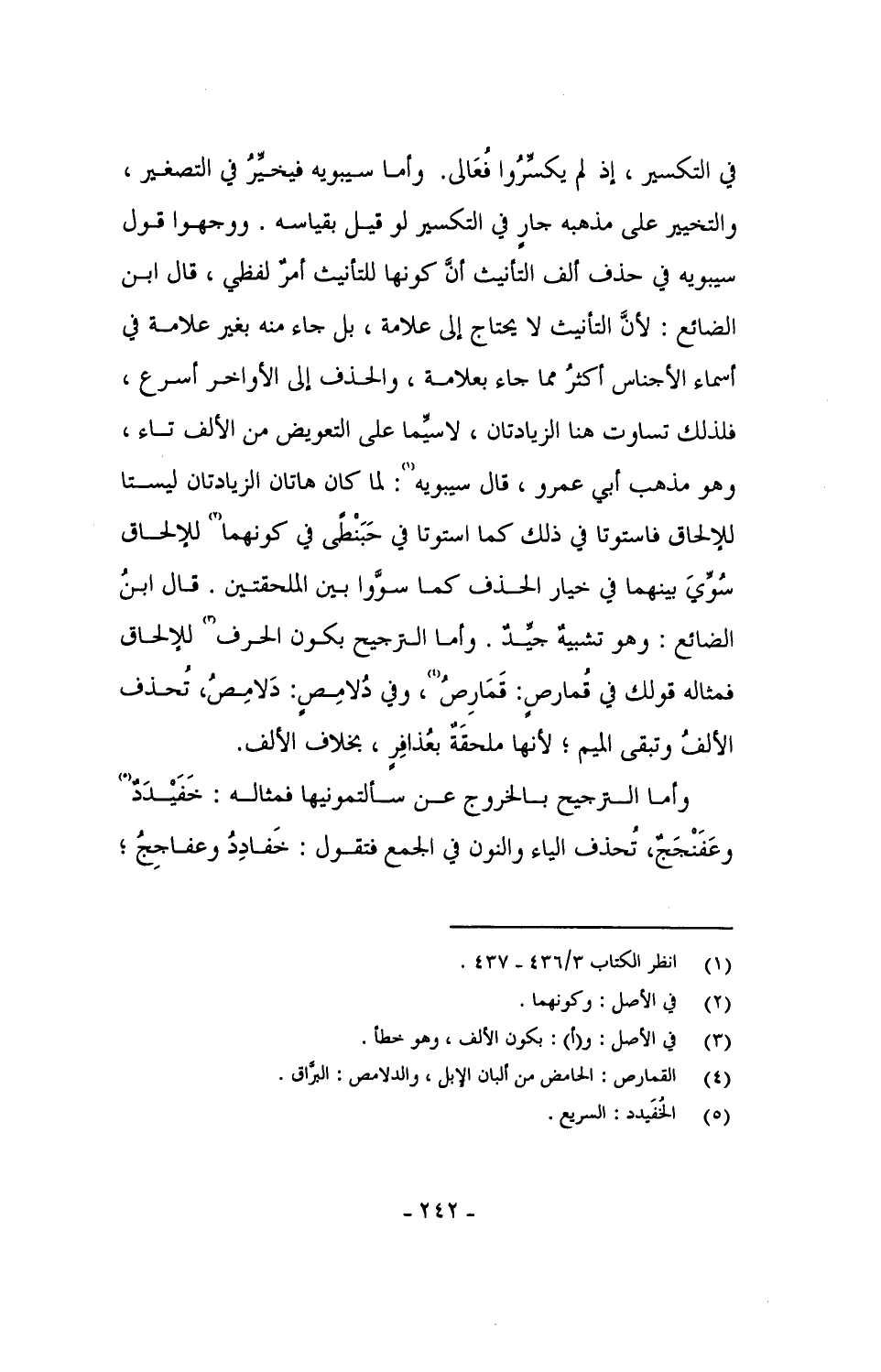 في التكسير، إذ لم يكسِّرُوا فُعَالى. وأما سيبويه فيخيِّرُ في التصغير، والتخيير على مذهبه جارٍ في التكسير لو قيل بقياسه. ووجهوا قول سيبويه في حذف ألف التأنيث أنَّ كونها للتأنيث أمر لفظي، قال ابن الضائع: لأن التأنيث لا يحتاج إلى علامة، بل جاء منه بغير علامة في أسماء الأجناس أكثرُ مما جاء بعلامة، والحذف إلى الأواخر أسرع، فلذلك تساوت هنا الزيادتان، لا سيما على التعويض من الألف تاء، وهو مذهب أبي عمرو، قال سيبويه: لما كان هاتان الزيادتان ليستا للإلحاق فاستوتا في ذلك كما استوتا في حَبَنْطًى في كونهما للإلحاق سُوِّيَ بينهما في خيار الحذف كا سوَّوا بين الملحقتين. قال ابنُ الضائع وهو تشبيهٌ جيَّدٌ. وأما الترجيح بكون الحرف للإلحاق فمثاله قولك في قُمارصٍ: قَمَارصُ، وفي دُلامِصٍ: دَلامِصُ، تحذف الألف وتبقى الميم؛ لأنها ملحقةٌ بعُذافِرٍن بخلاف الألف.
