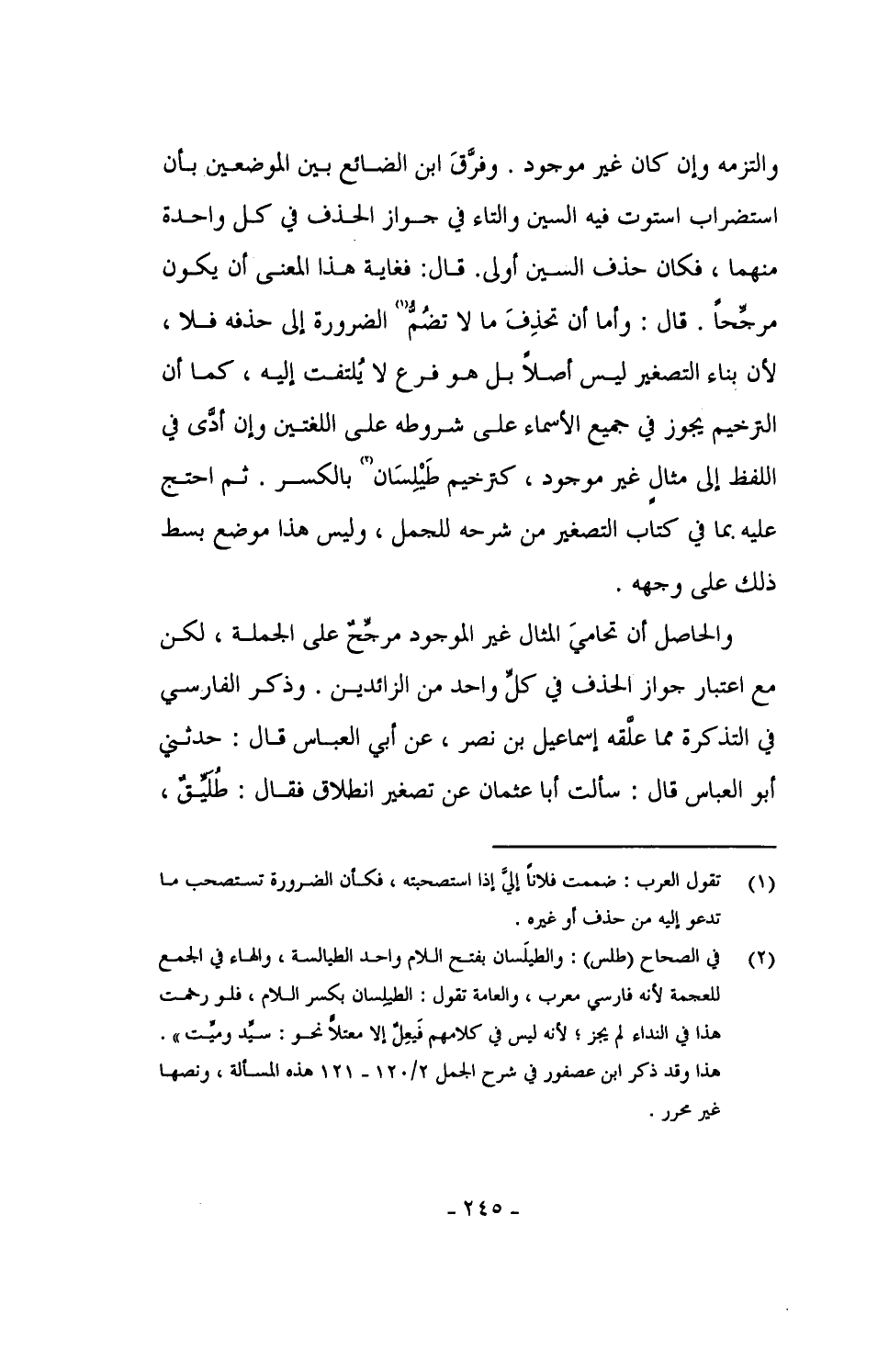 والتزمه وإن كان غير موجود. وفرَّق ابن الضائع بين الموضعين بأن استضراب استوت فيه السين والتاء في جواز الحذف في كل واحدة منهما، فكان حذف السين أولى. قال: فغاية هذا المعنى أن يكون مرجِّحاً. قال: وأما أن تحذف ما لا تضُم الضرورة إلى حذفه فلا، لأن بناء التصغير ليس أصلاً بل هو فرع لا يُلتفت إليه، كما أن الترخيم يجوز في جميع الأسماء على شروطه على اللغتين وإن أدَّى في اللفظ إلى مثال غير موجود، كترخيم طَيْلَسَان بالكسر. ثم احتج عليه بما في كتاب التصغير من شرحه للجمل، وليس هذا موضع بسط ذلك على وجهه.